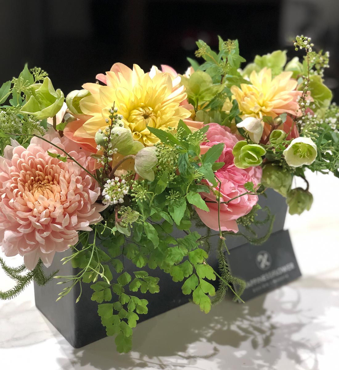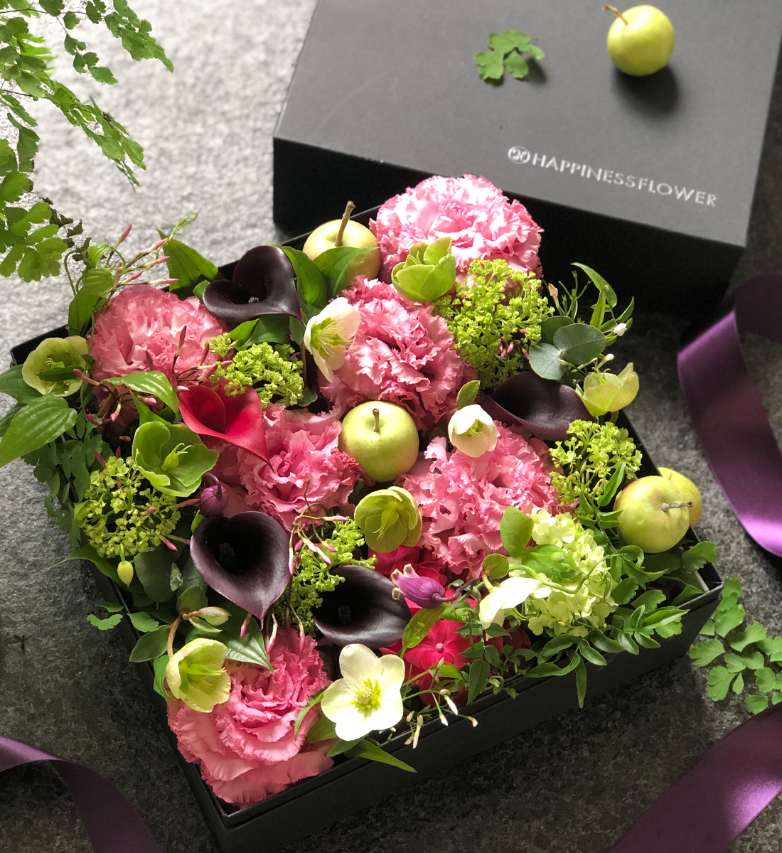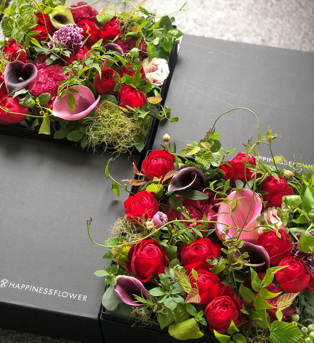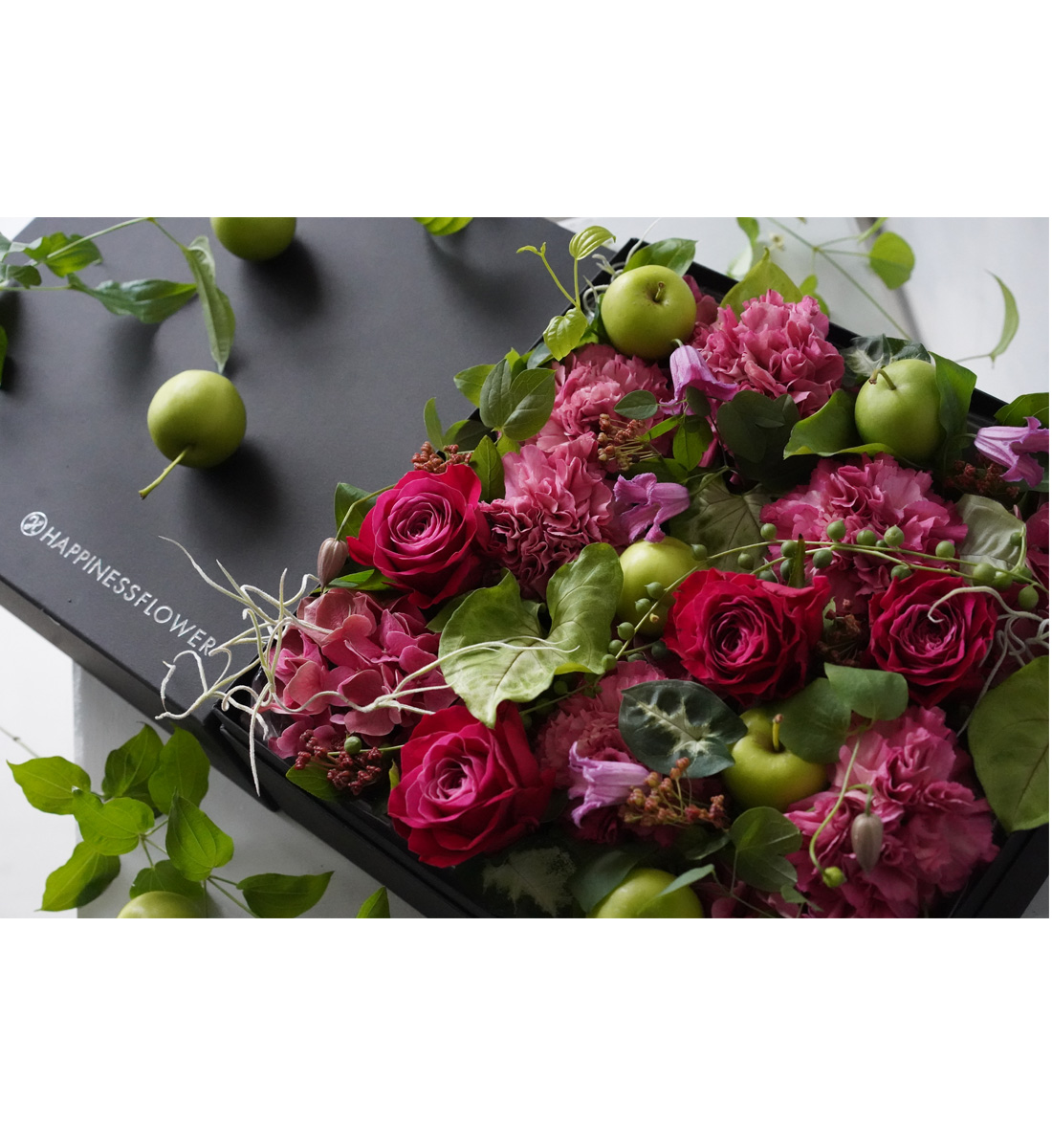 四角い箱の中は、贅沢に敷き詰められた綺麗な花々。箱を開けた瞬間に広がる心地よい香りのフレグランスと花の美しさが凝縮されたデザインのボックスフラワーは幸せ感いっぱいでサプライズギフトやスマートな花贈りに最適です。