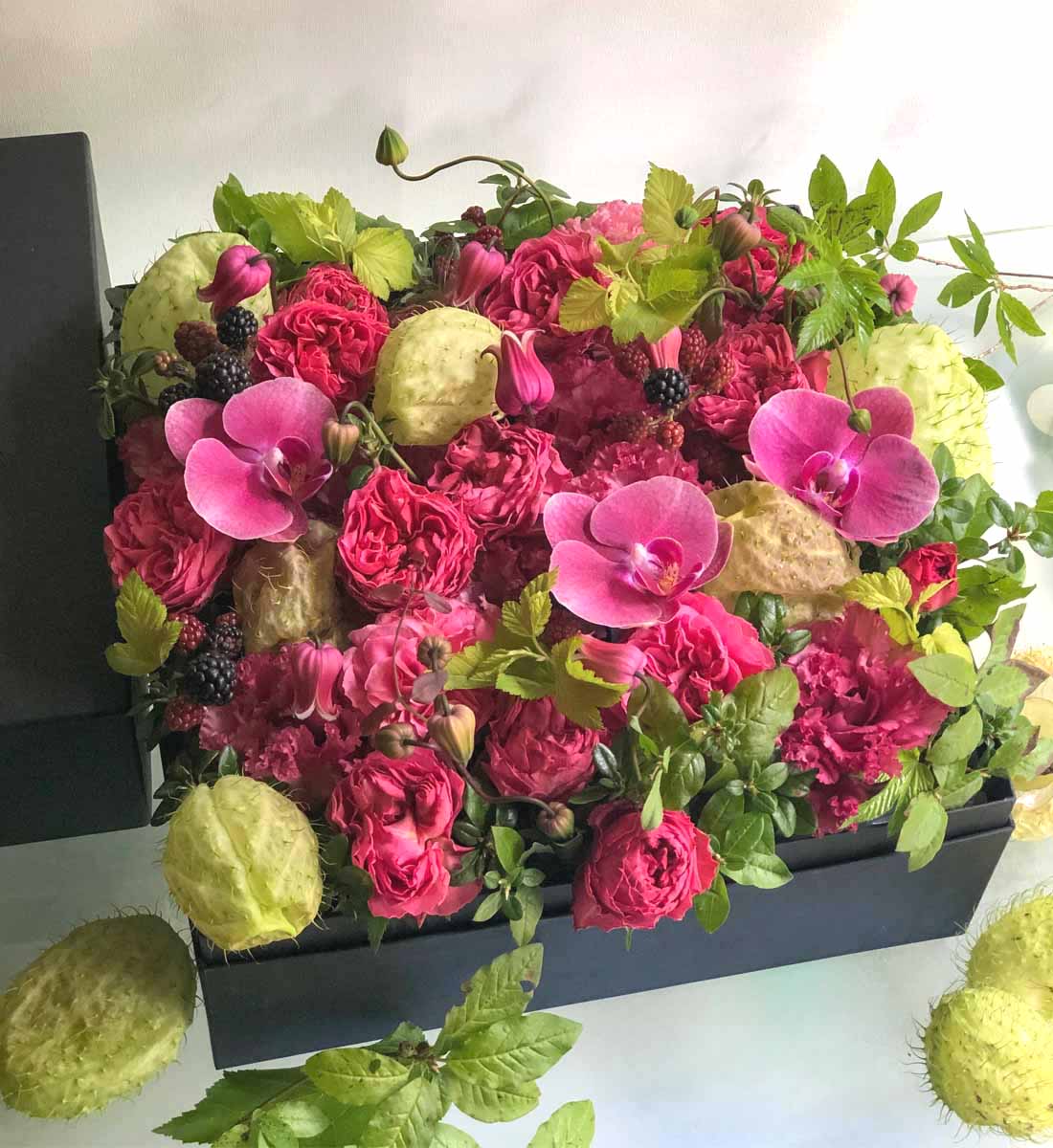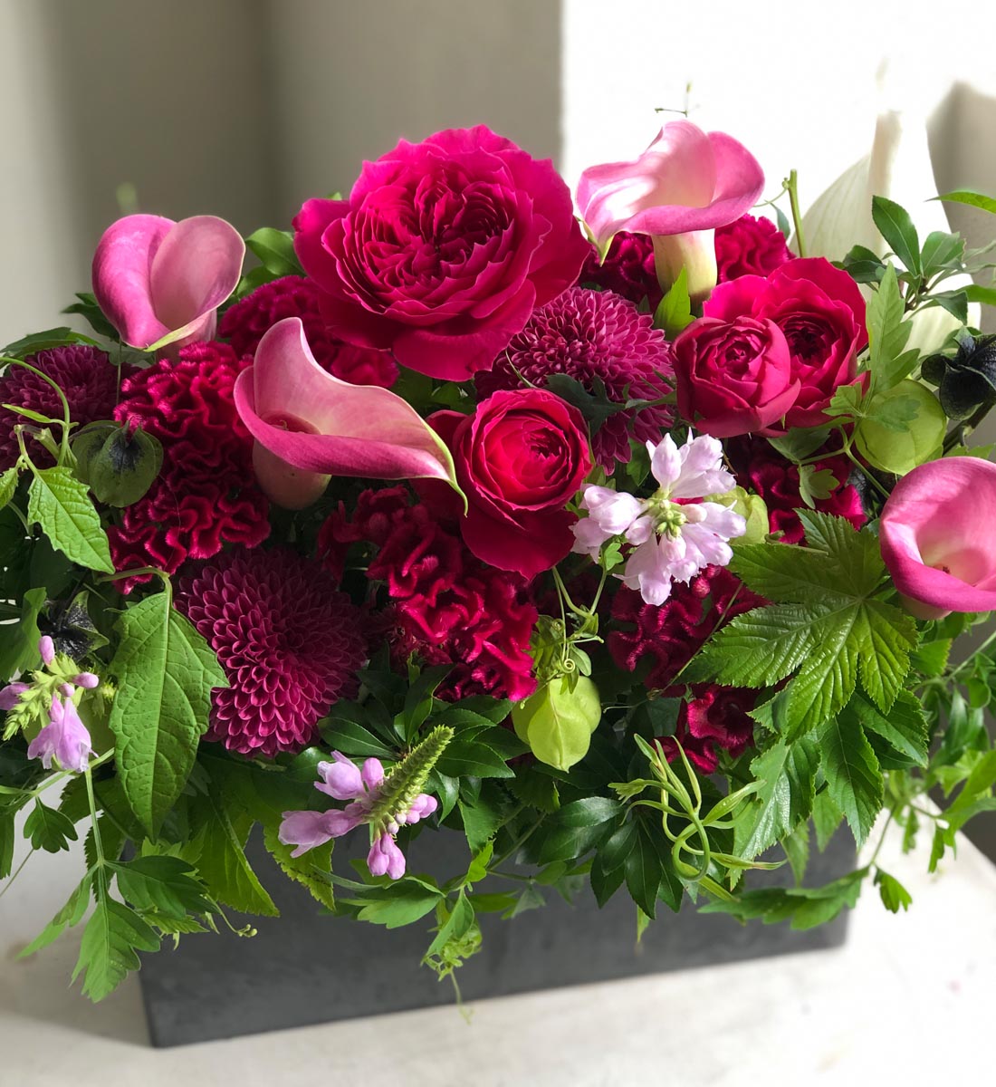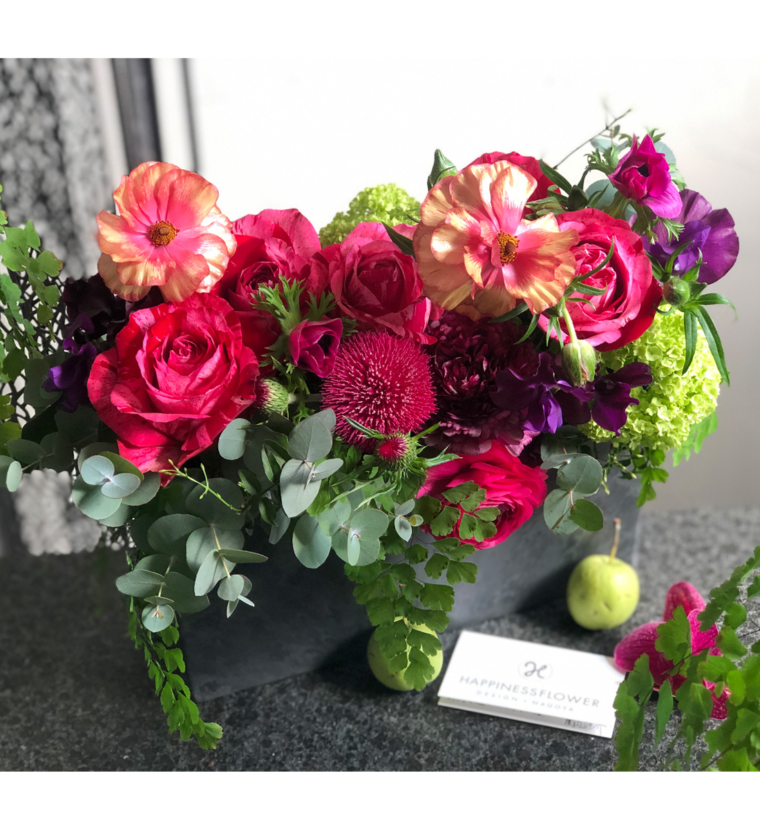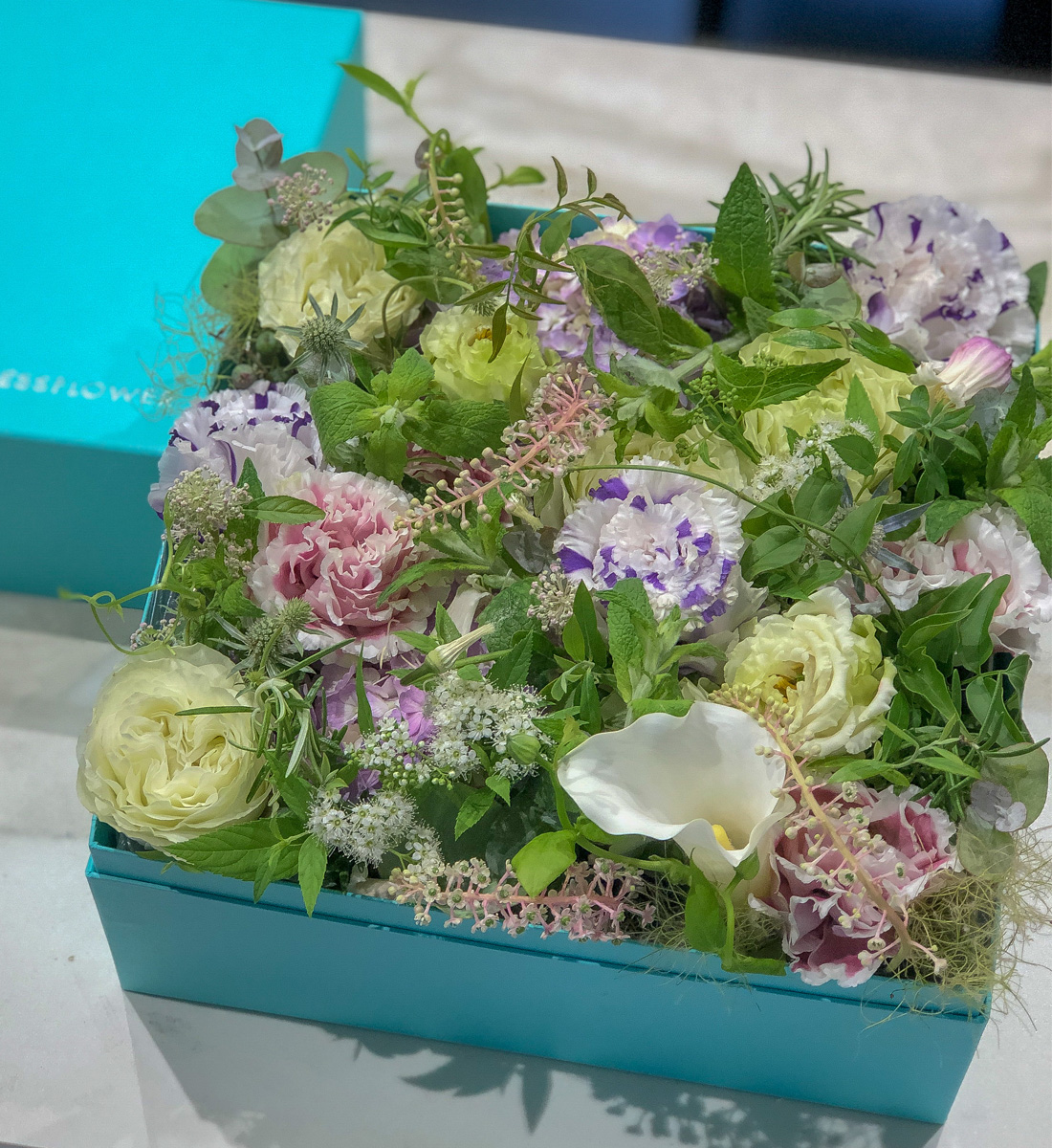 四角い箱の中は、贅沢に敷き詰められた綺麗な花々。箱を開けた瞬間に広がる心地よい香りのフレグランスと花の美しさが凝縮されたデザインのボックスフラワーは幸せ感いっぱいでサプライズギフトやスマートな花贈りに最適です。