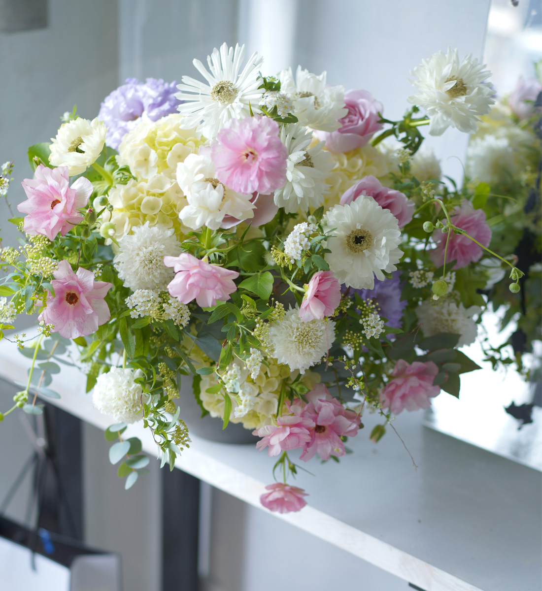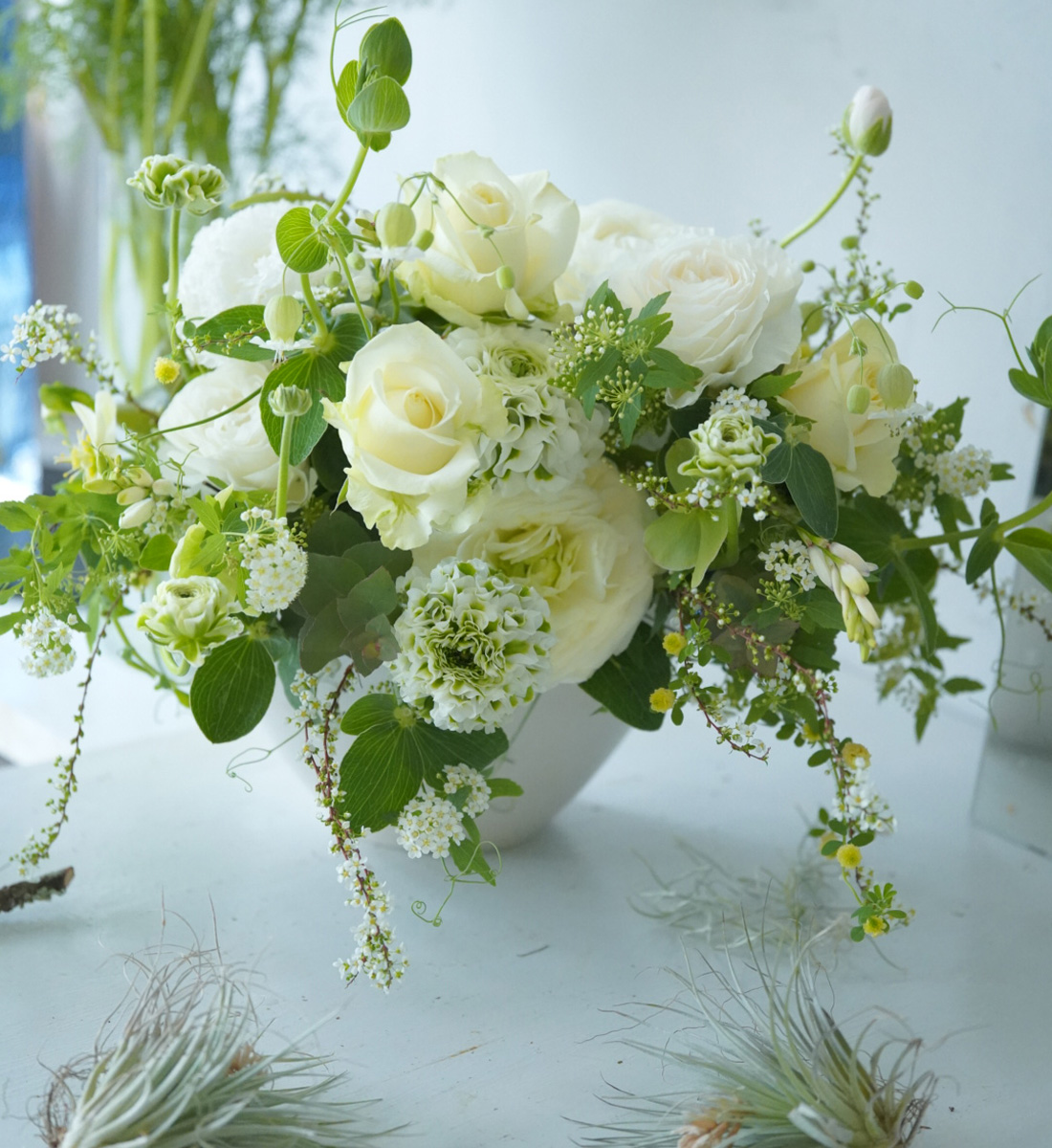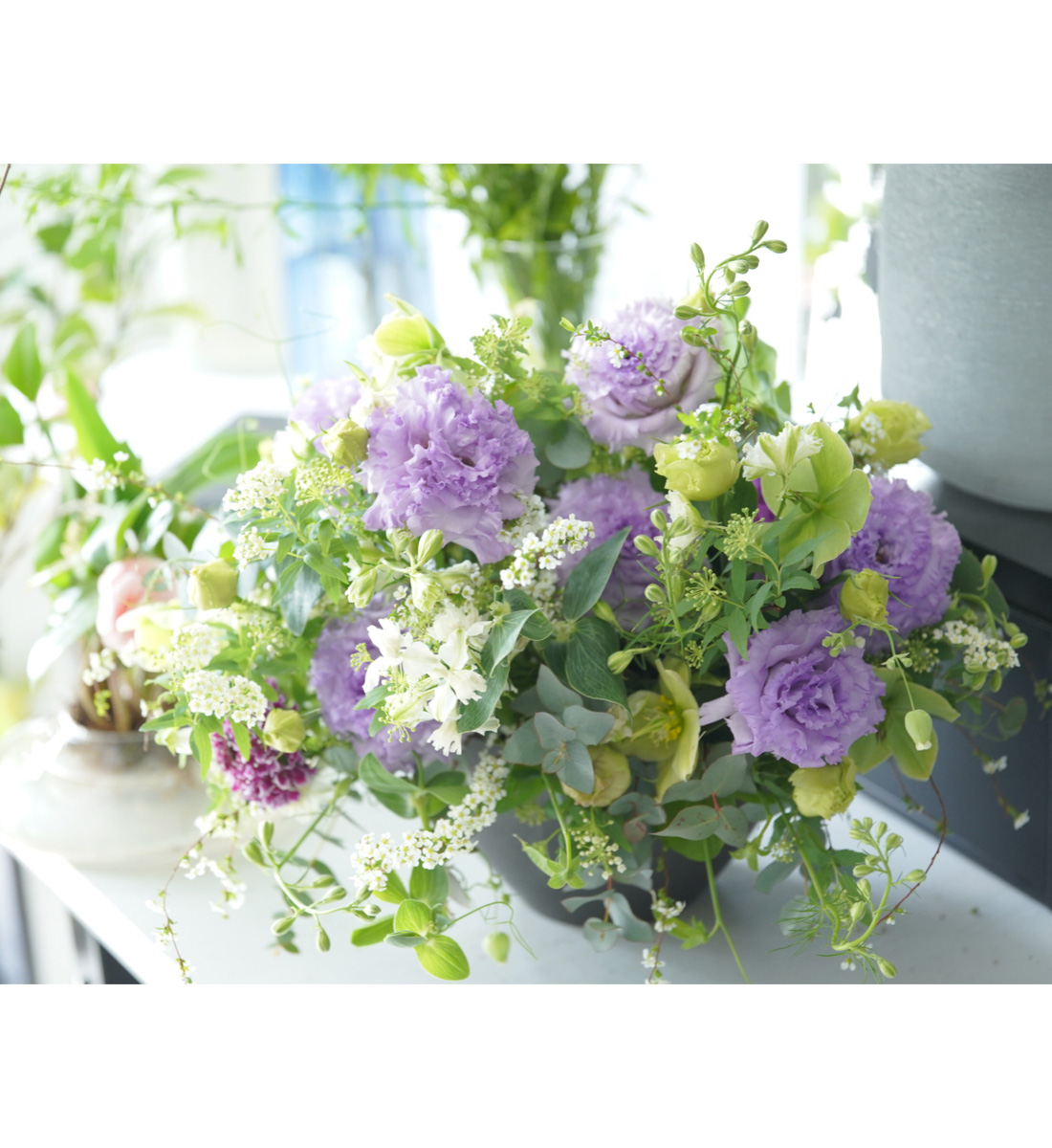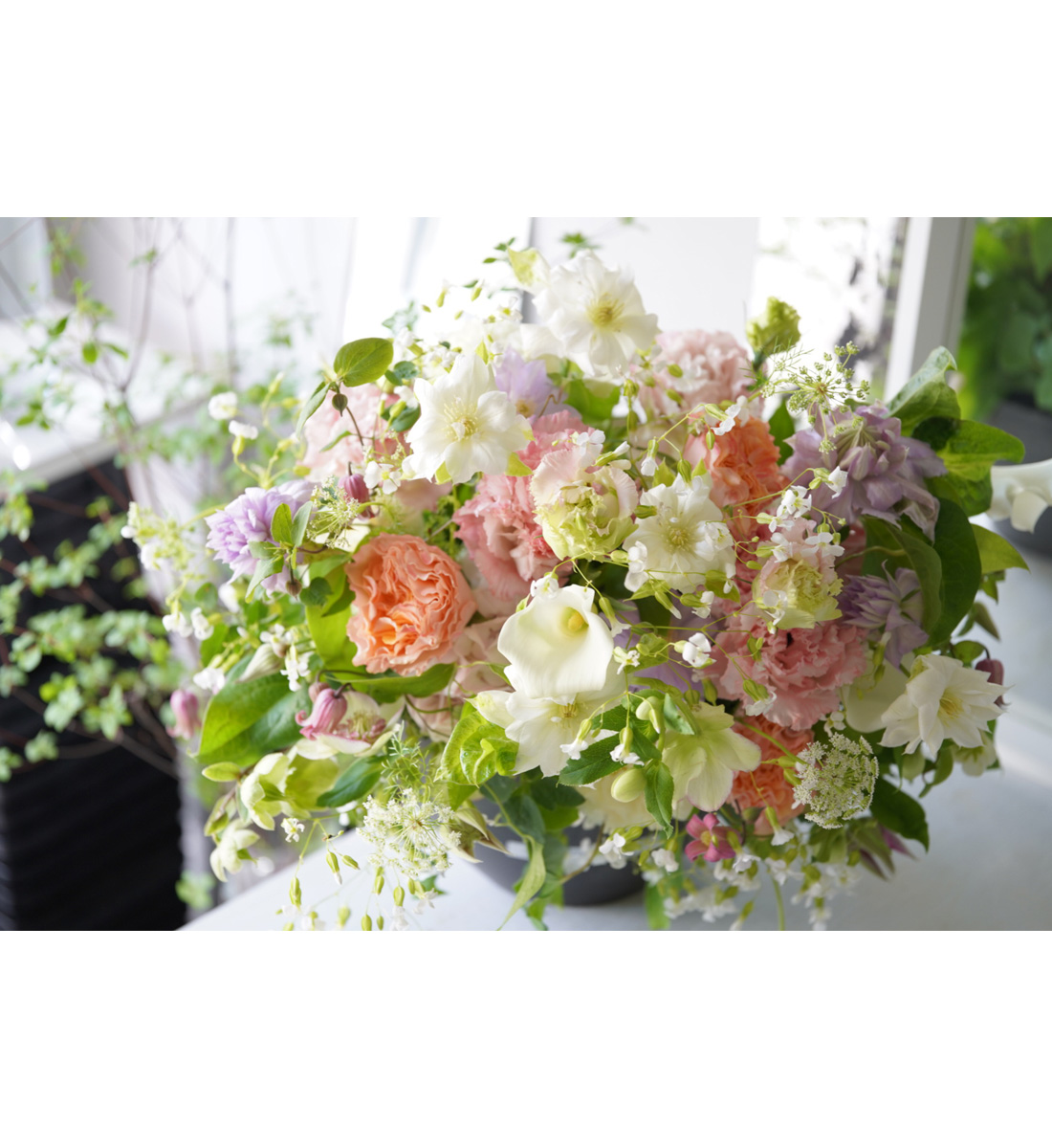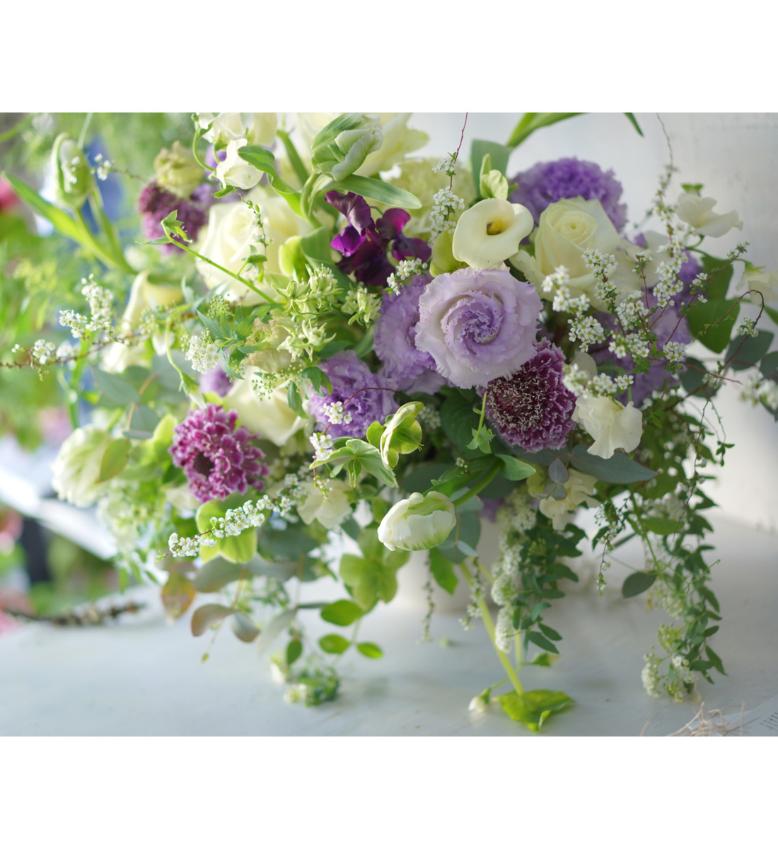 自然美を感じて頂ける素材のコンポジションでデザインいたします。低いスタイルでベースから溢れ出すようにアレンジされた花は自然で美しく贅沢です。