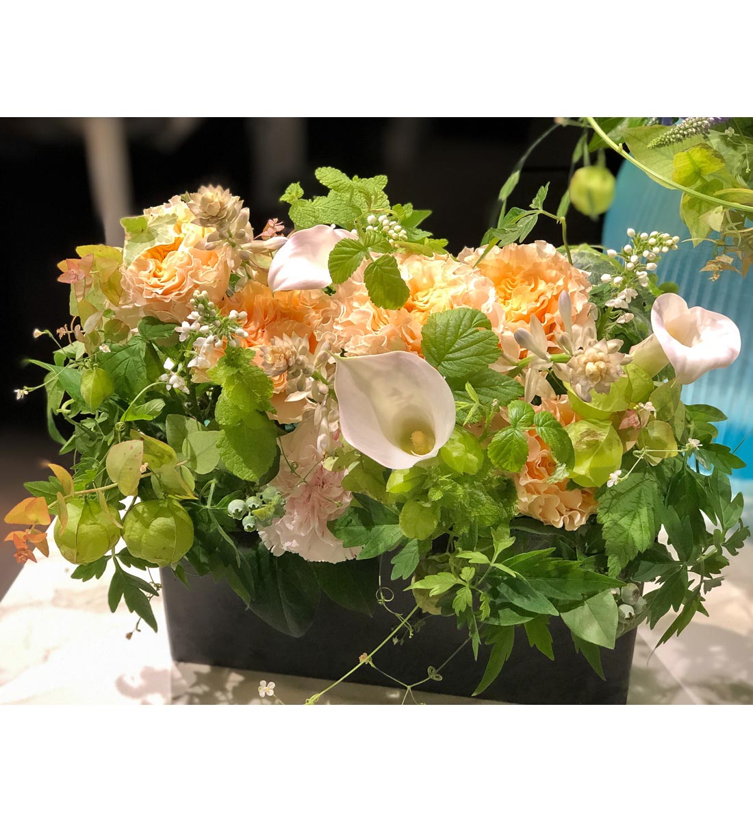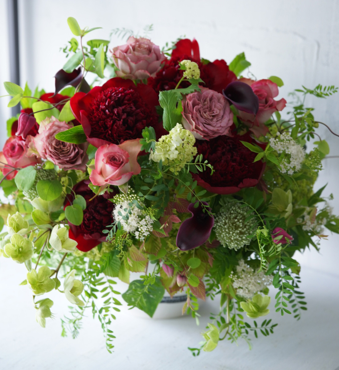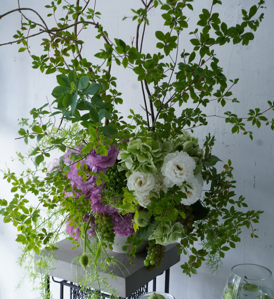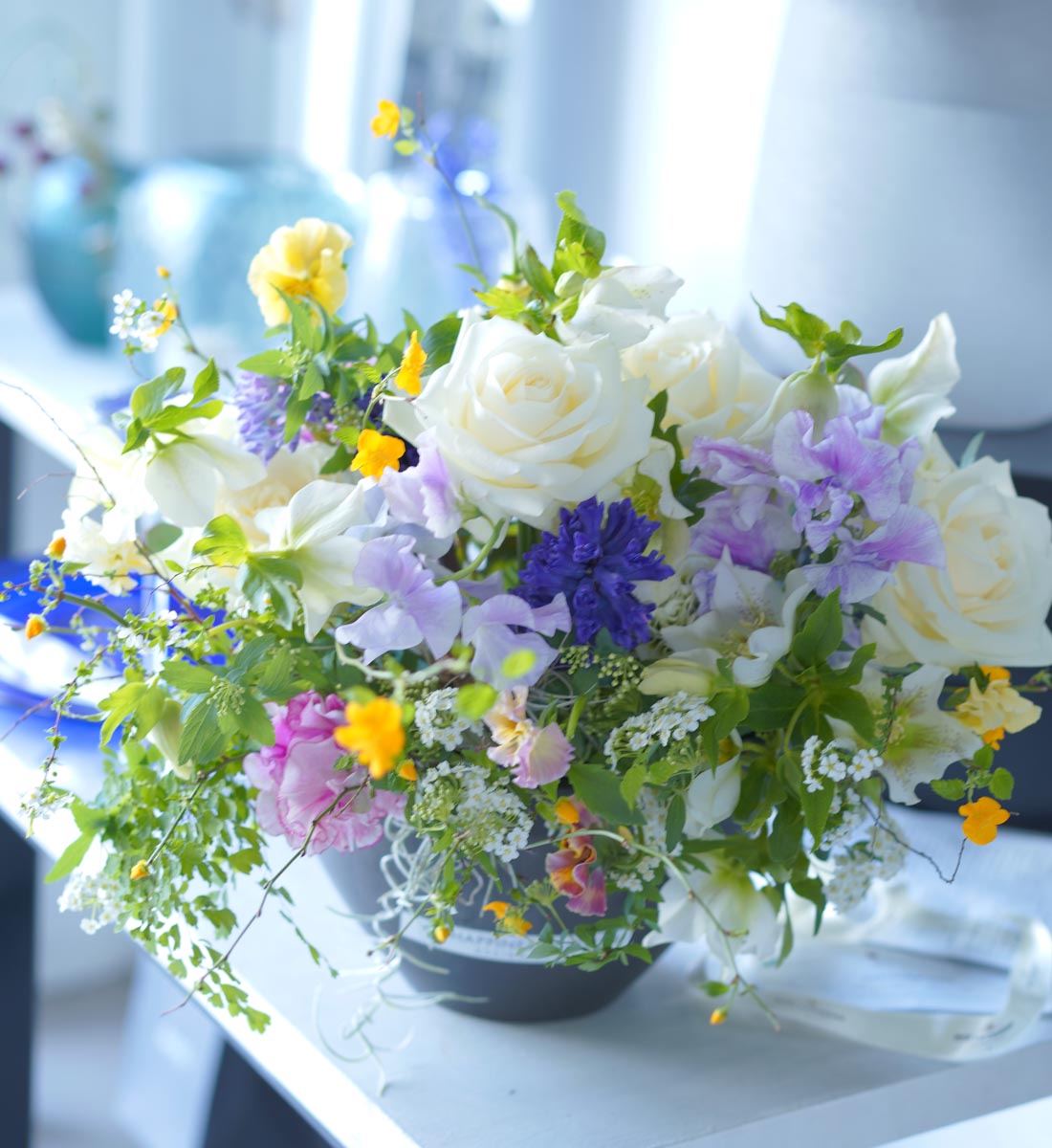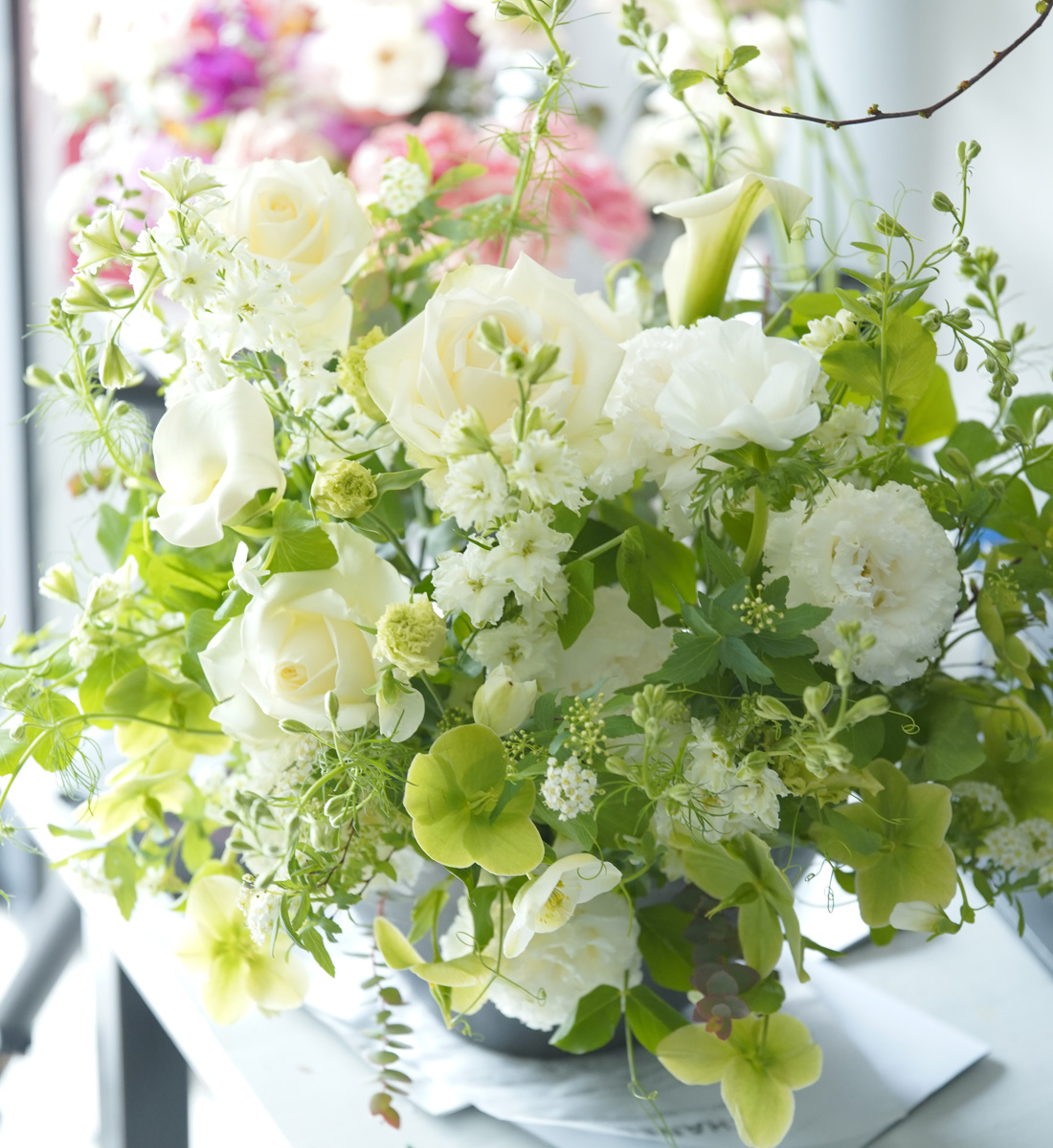 自然美を感じて頂ける素材のコンポジションでデザインいたします。低いスタイルでベースから溢れ出すようにアレンジされた花は自然で美しく贅沢です。