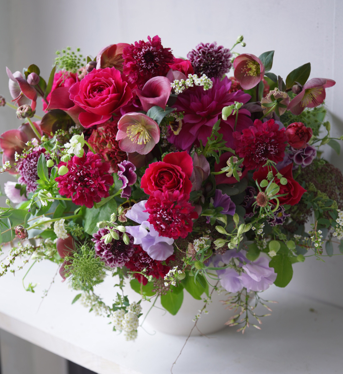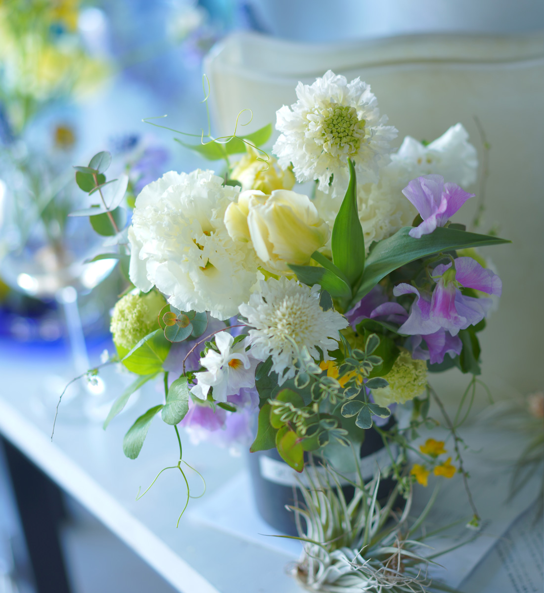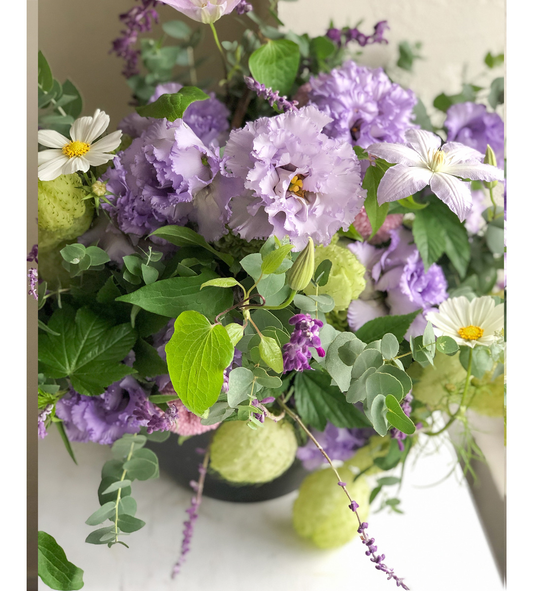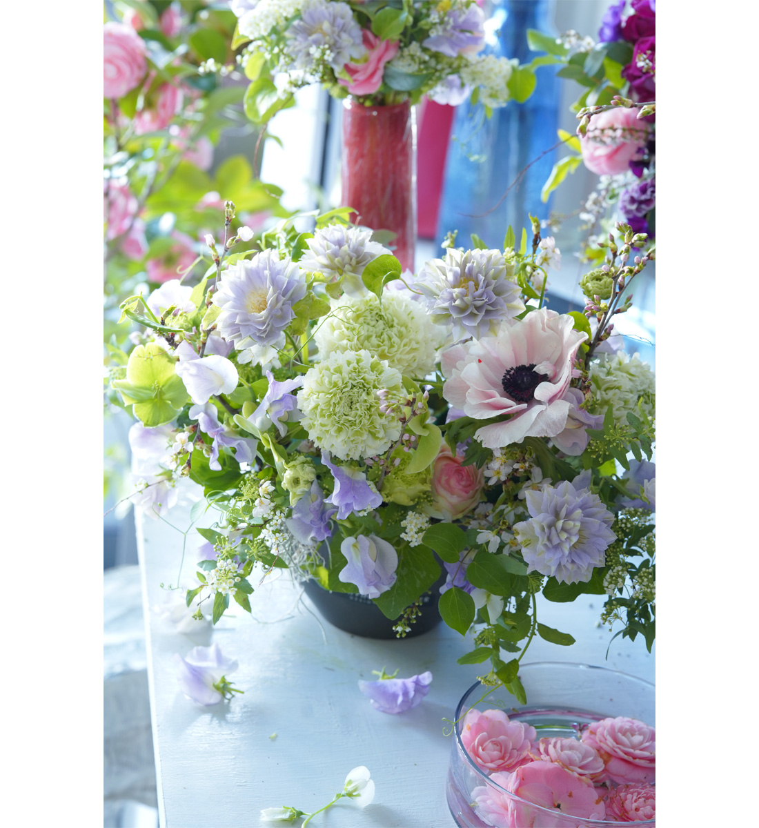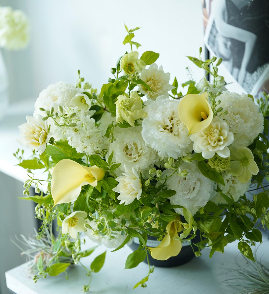 自然美を感じて頂ける素材のコンポジションでデザインいたします。低いスタイルでベースから溢れ出すようにアレンジされた花は自然で美しく贅沢です。