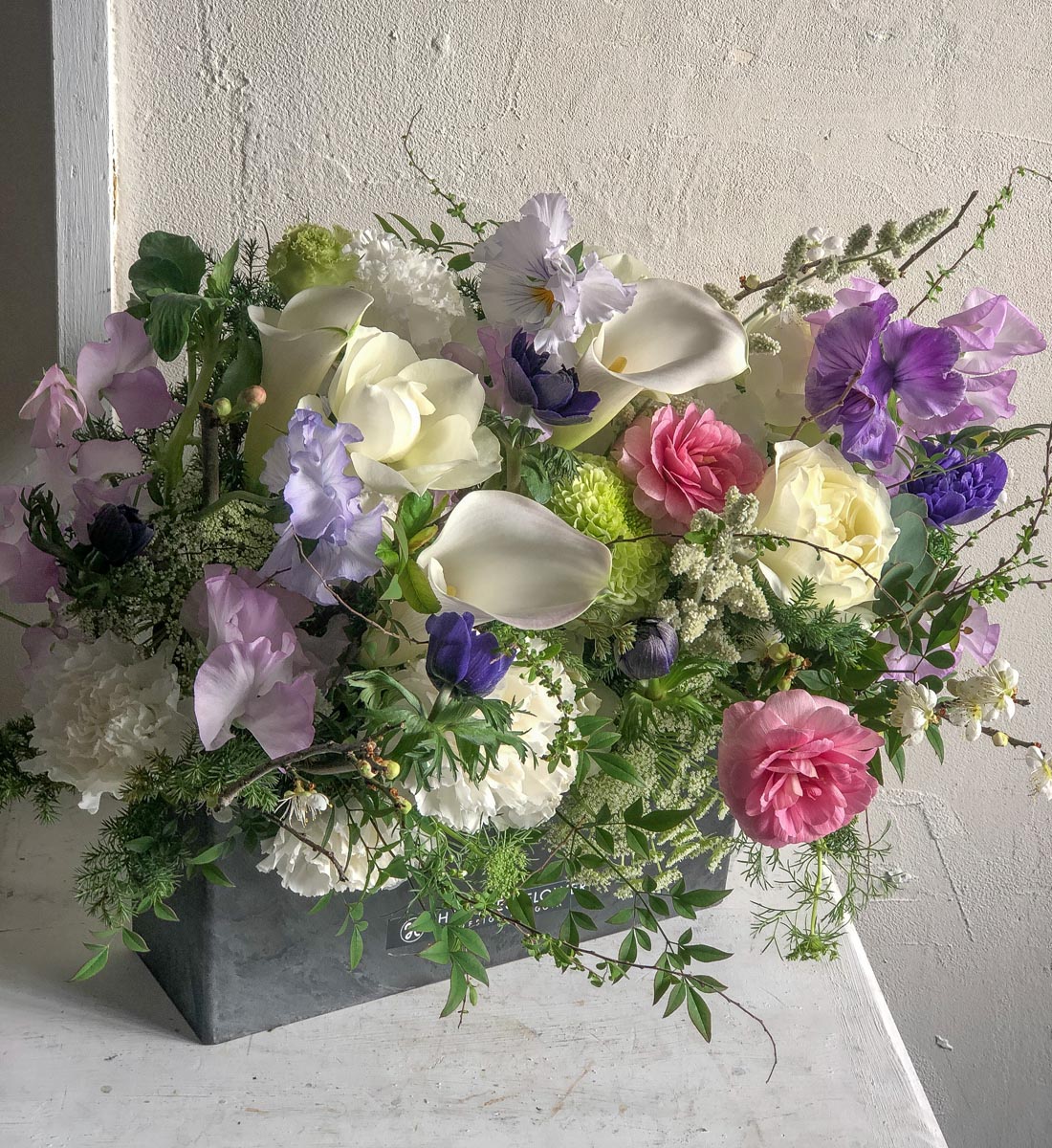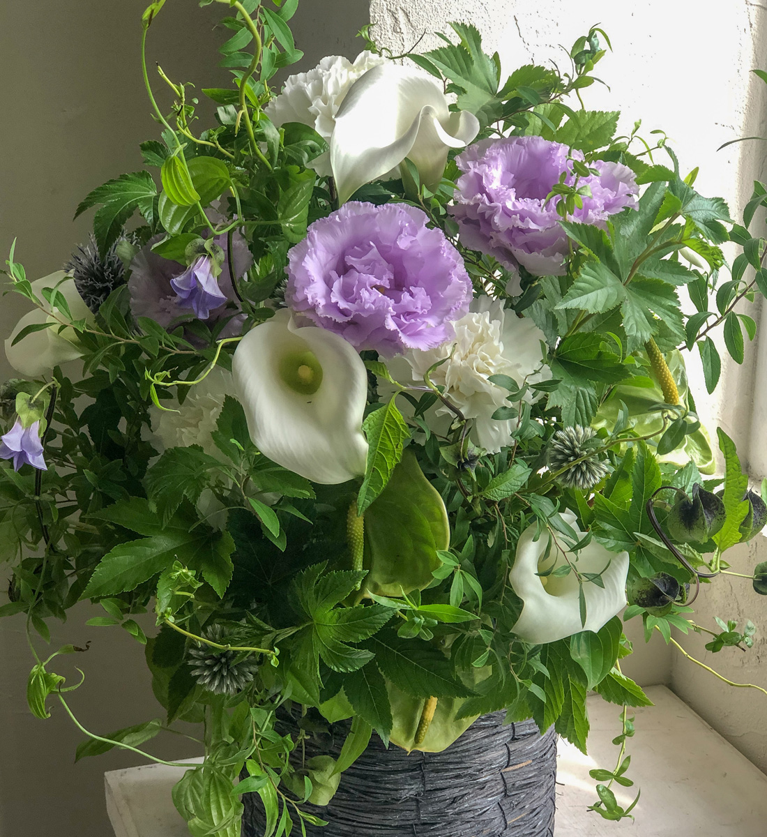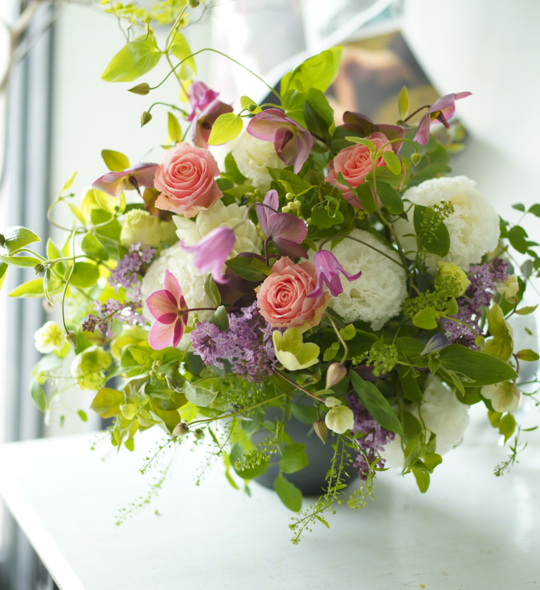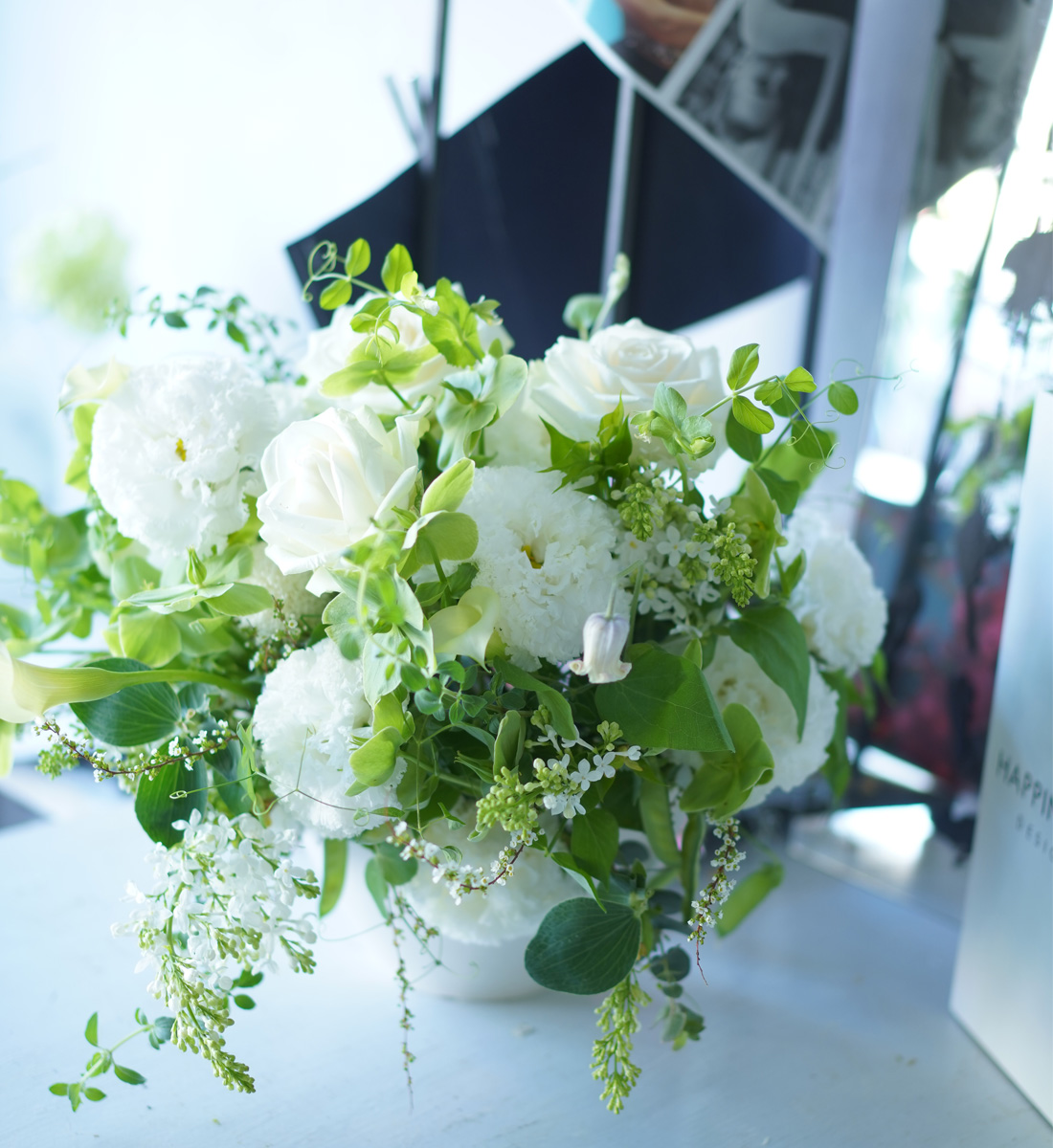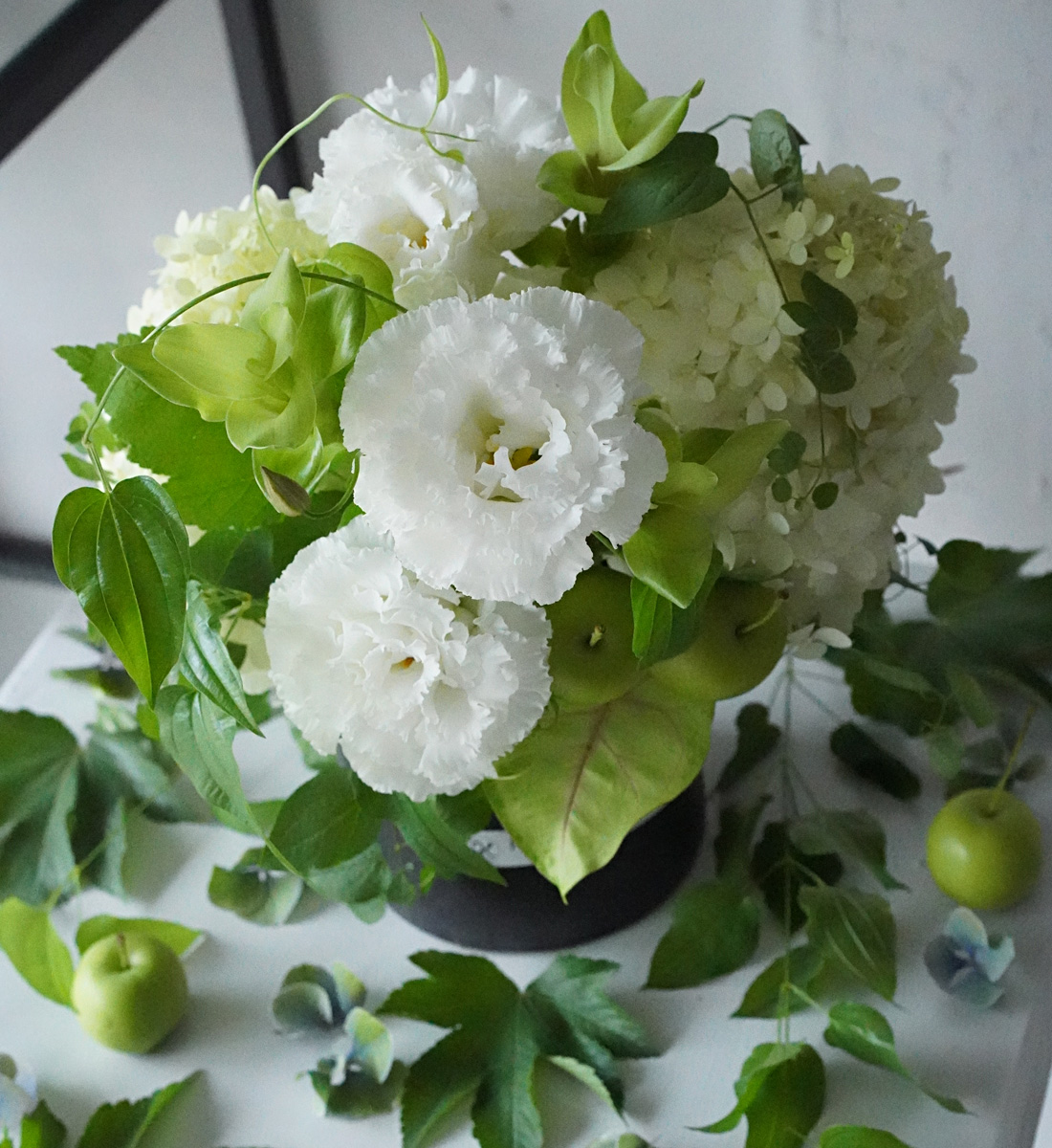 自然美を感じて頂ける素材のコンポジションでデザインいたします。低いスタイルでベースから溢れ出すようにアレンジされた花は自然で美しく贅沢です。