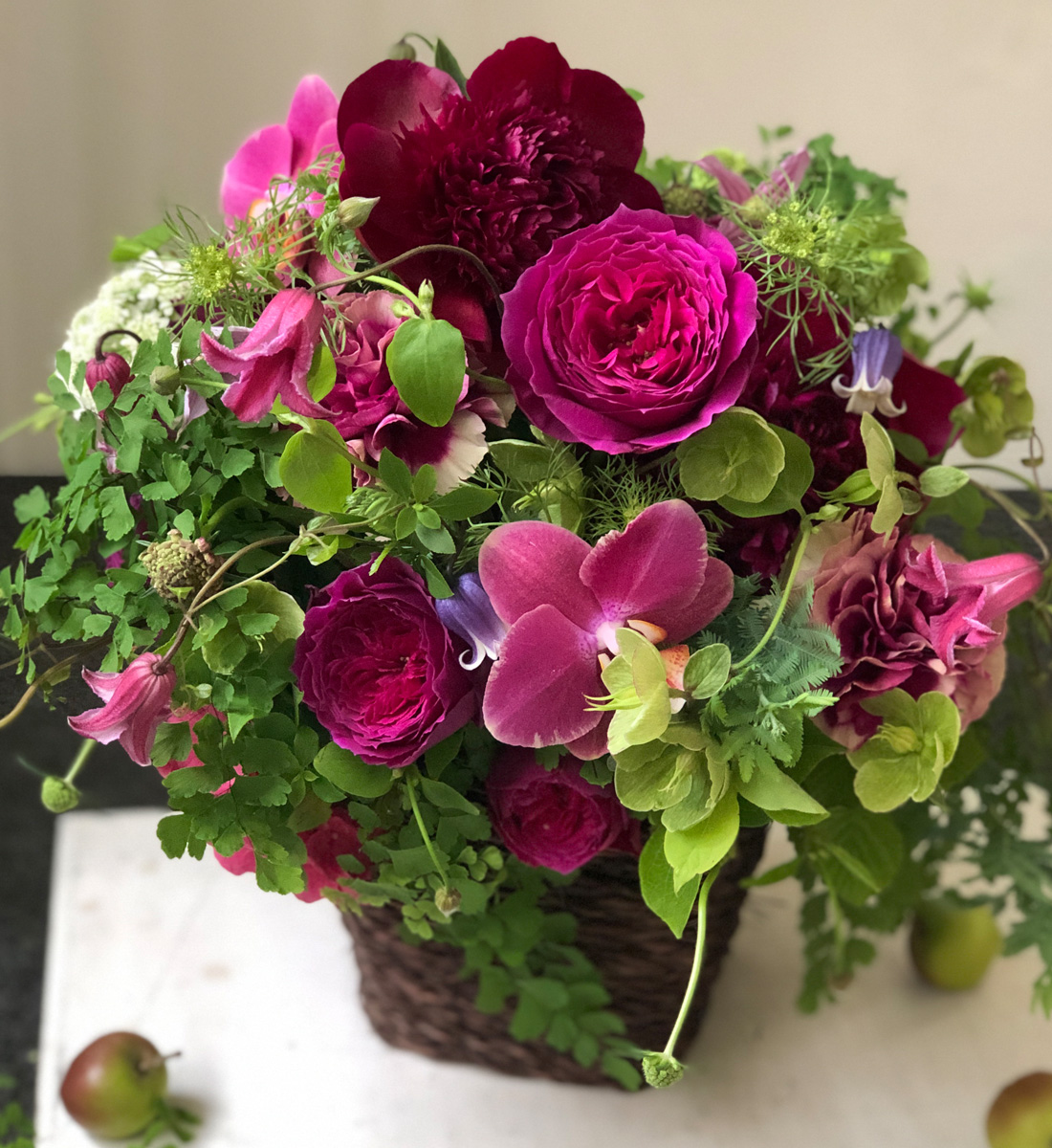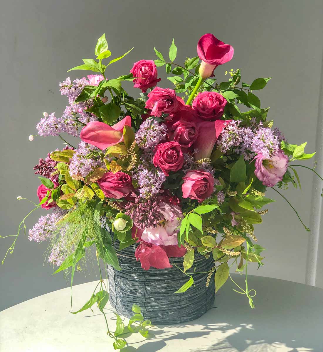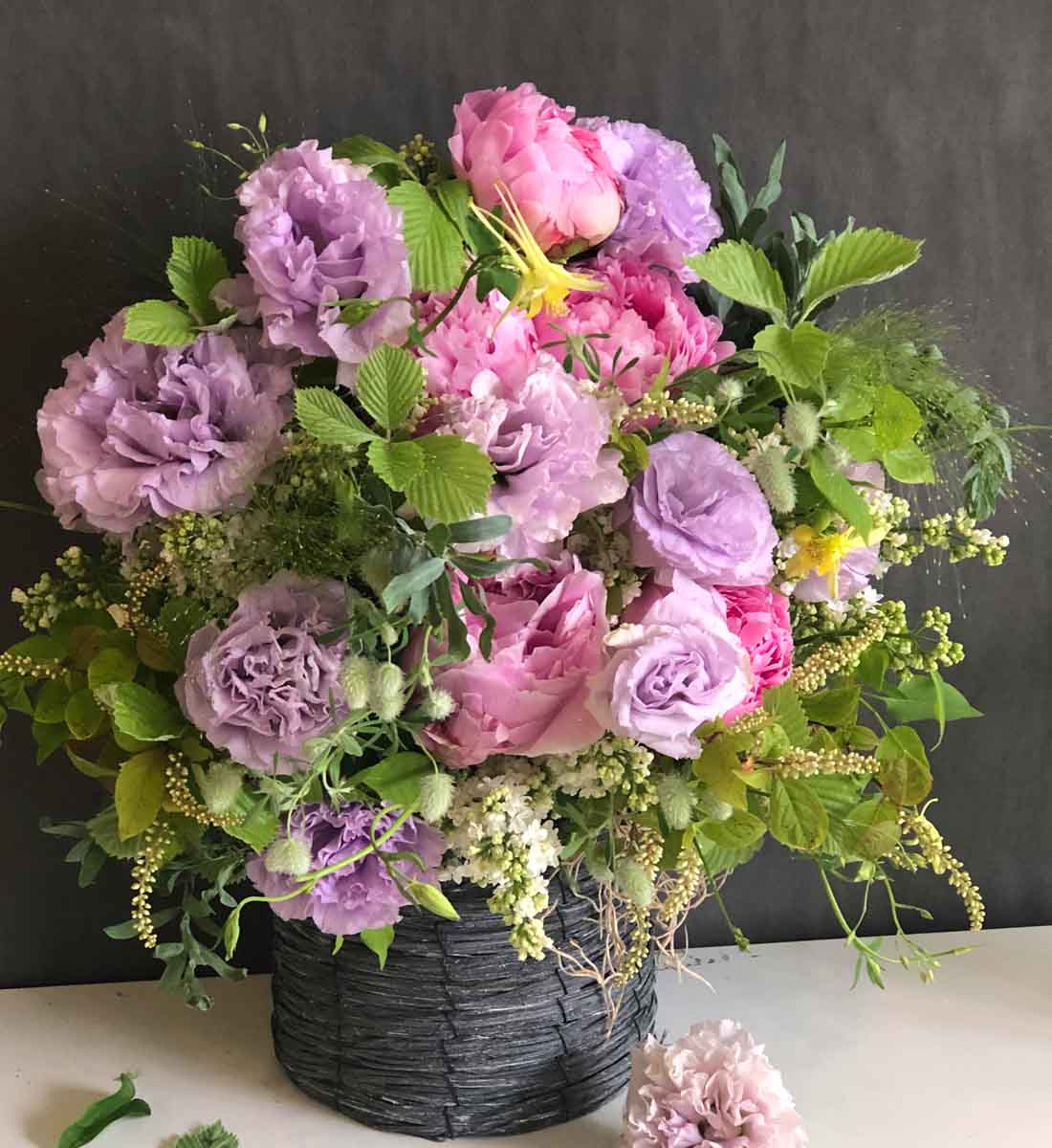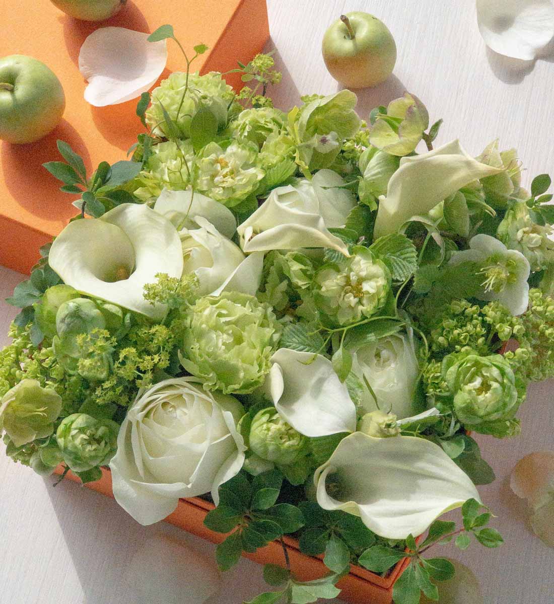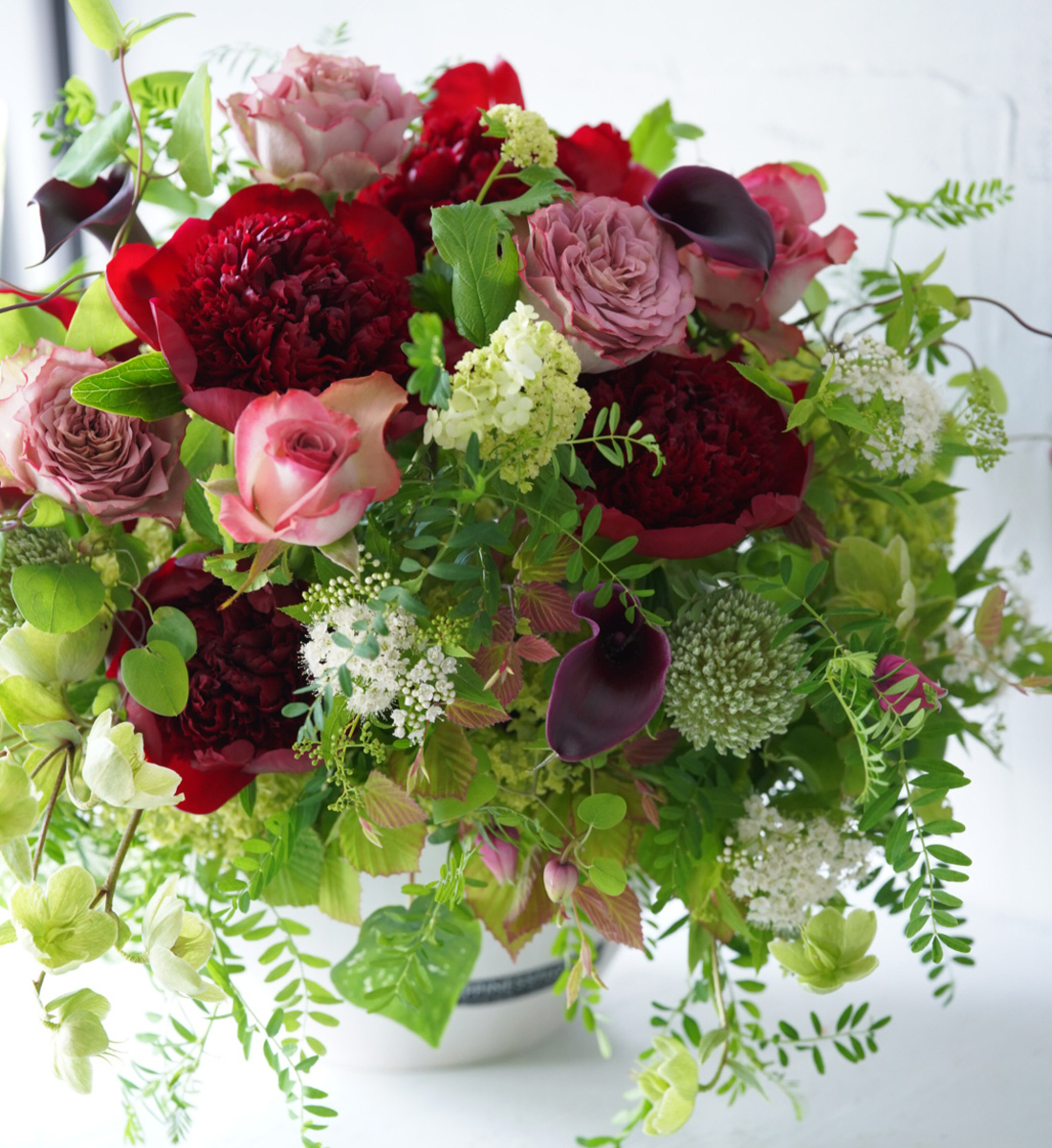 自然美を感じて頂ける素材のコンポジションでデザインいたします。低いスタイルでベースから溢れ出すようにアレンジされた花は自然で美しく贅沢です。