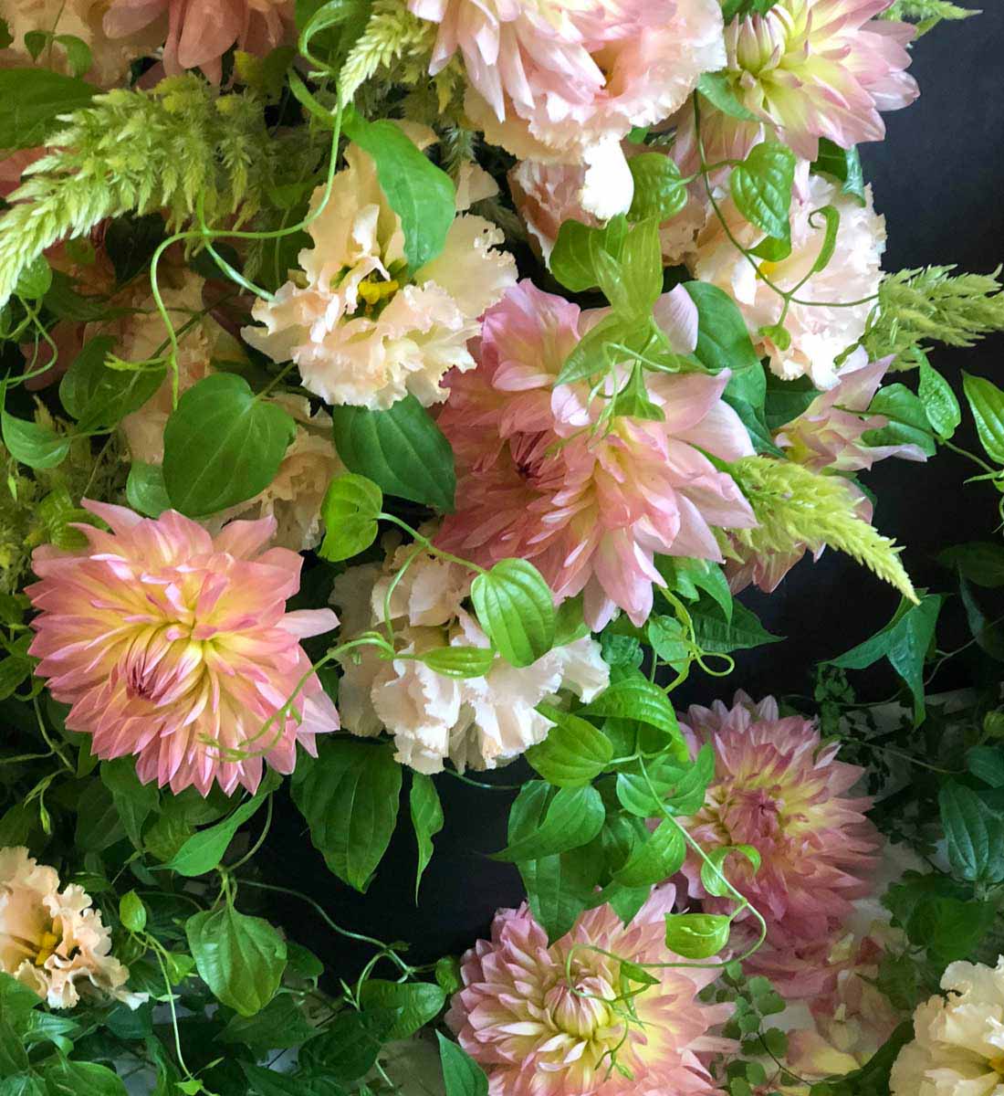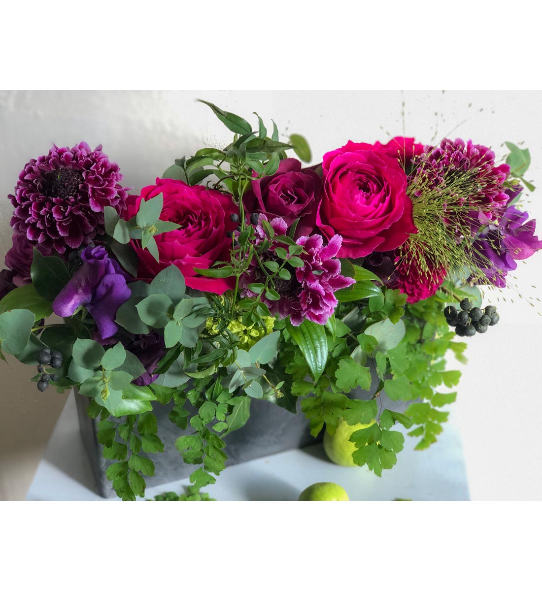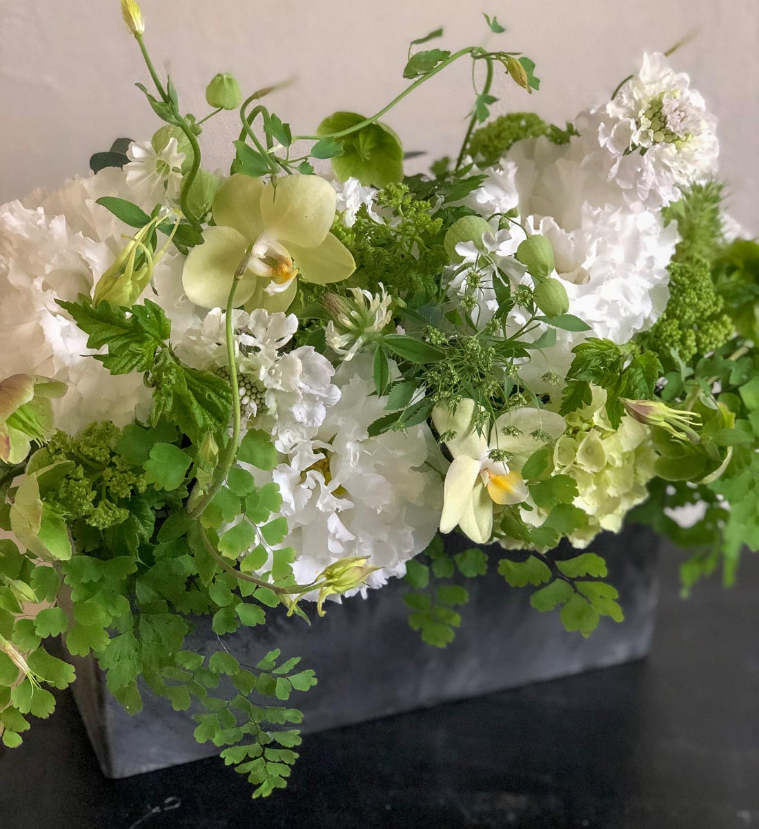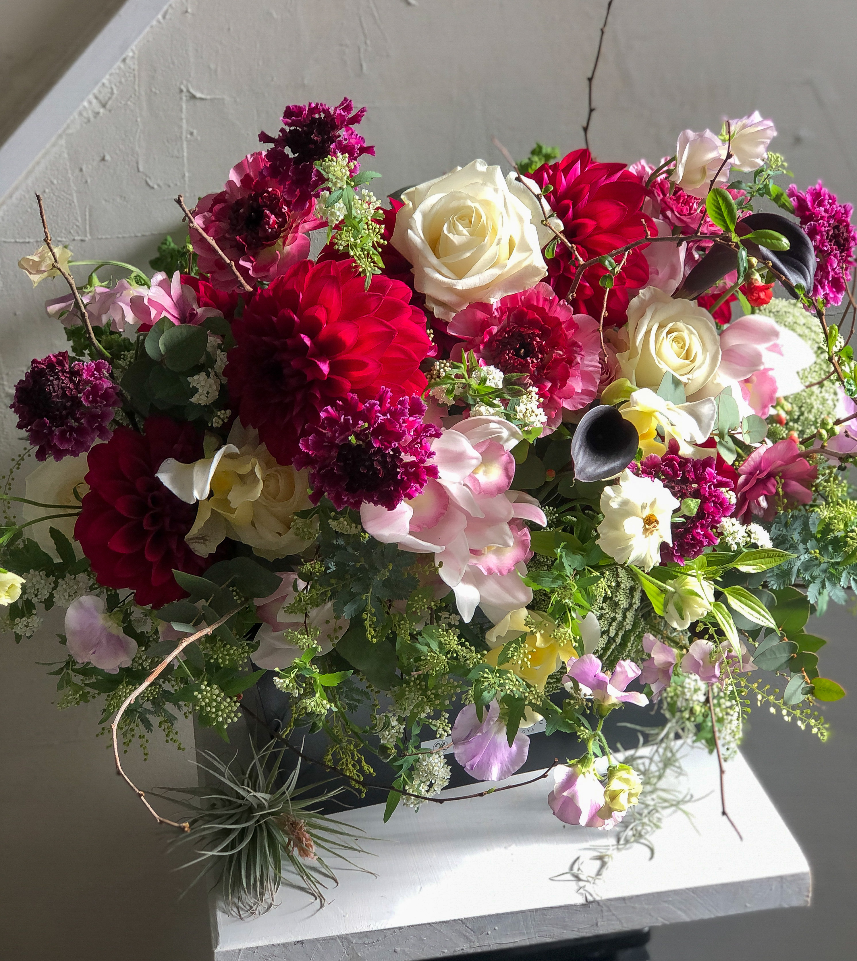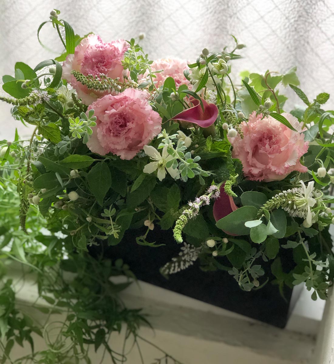 自然美を感じて頂ける素材のコンポジションでデザインいたします。低いスタイルでベースから溢れ出すようにアレンジされた花は自然で美しく贅沢です。