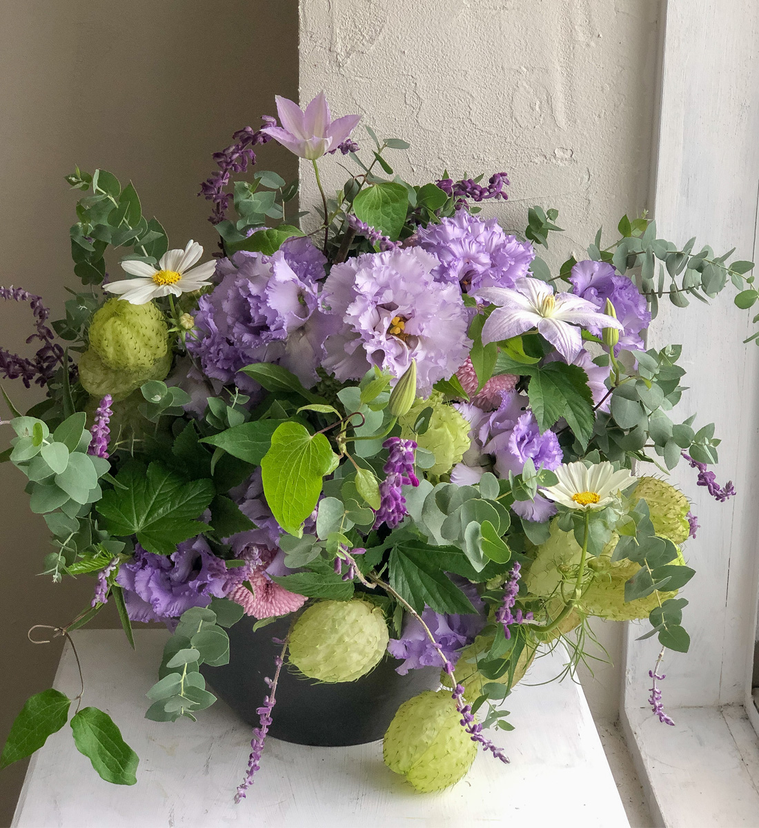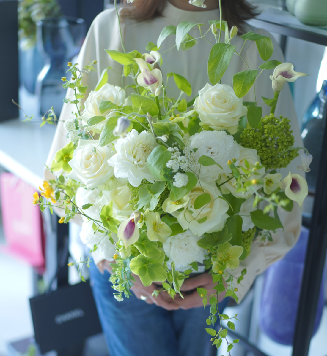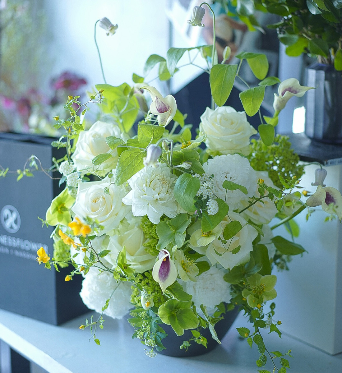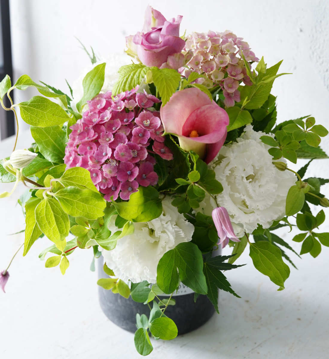素材やサイズ感を合わせたコンポジションでデザインいたします。丸いスタイルでこんもりとアレンジされた花は、優しい印象でどんな場所でもマッチいたしますので、手土産などにも最適です。