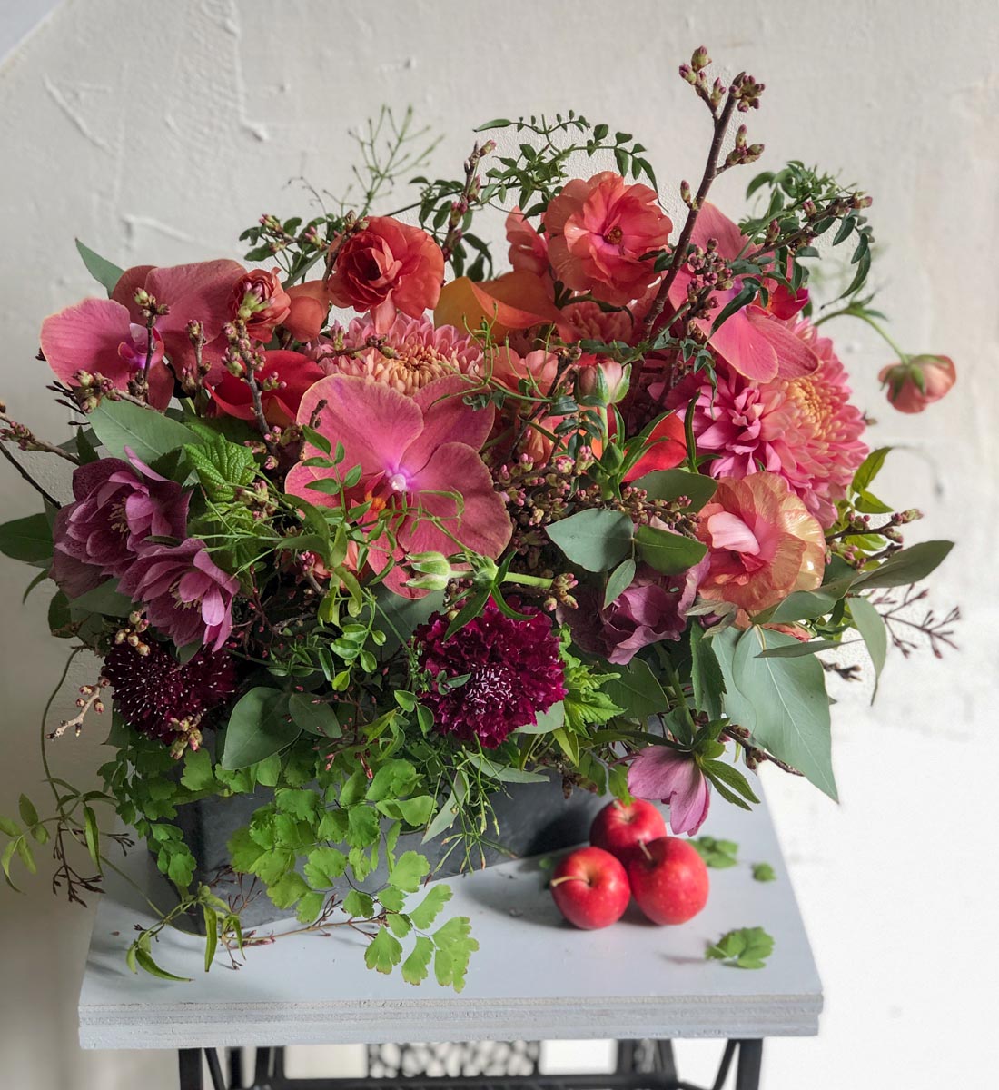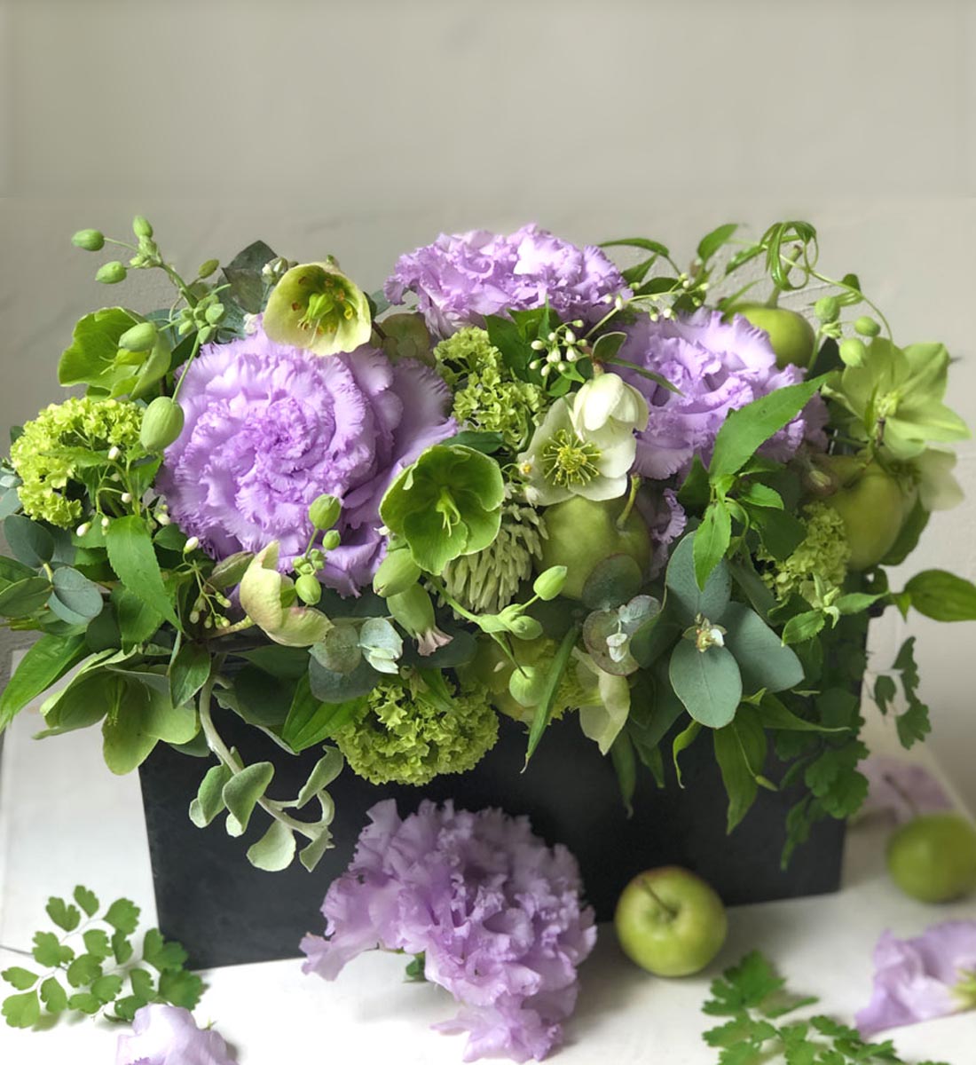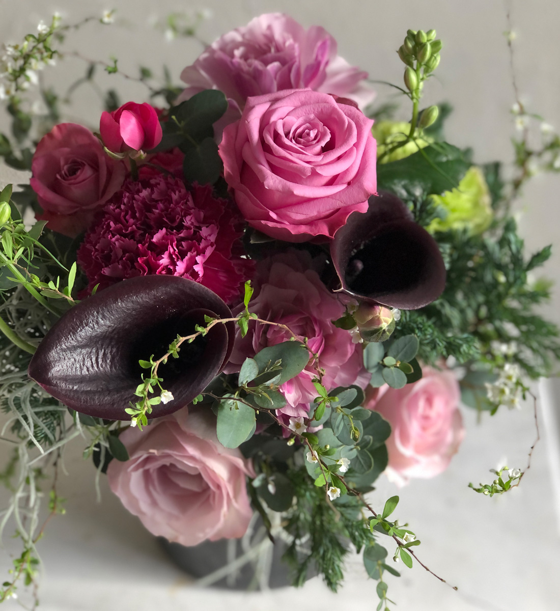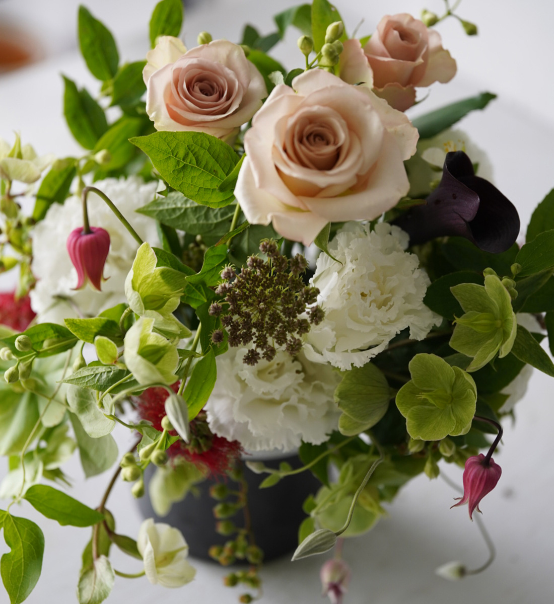 素材やサイズ感を合わせたコンポジションでデザインいたします。丸いスタイルでこんもりとアレンジされた花は、優しい印象でどんな場所でもマッチいたしますので、手土産などにも最適です。