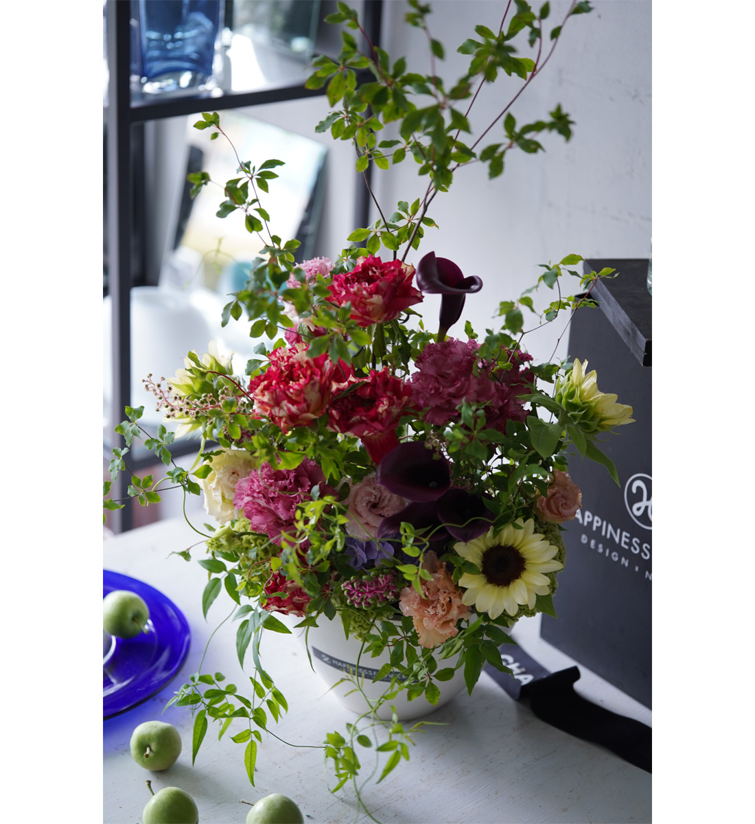 その時に一番綺麗な花やカラーパレット、シーンにベストマッチした花でデザインをする「HAPPINESSセレクション」と、クライアント様やお届け先様のイメージに合わせてお選び頂ける3つのカラータイプよりお選びください。