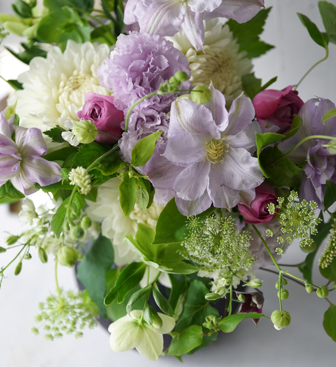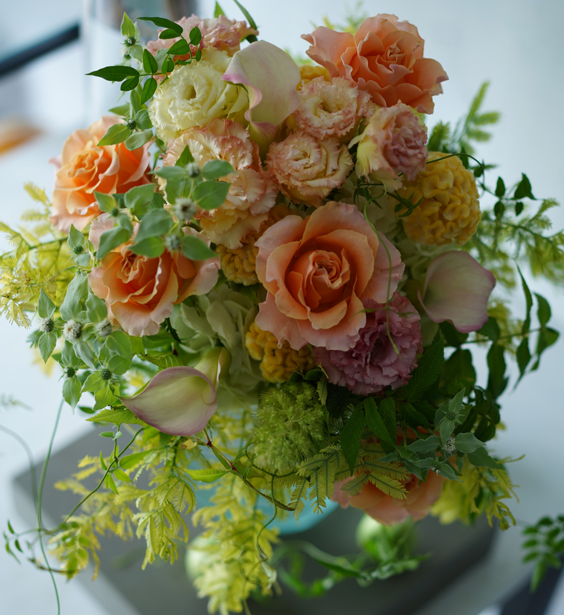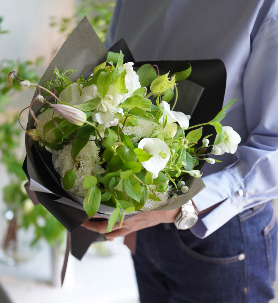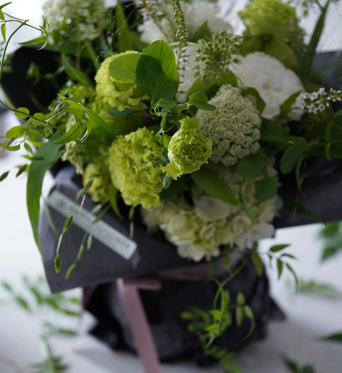 花の密度をギュッと凝縮したデザインで丸型スタイルの花束です。自然の法則を取り入れて素材感に合わせたレイヤーで作るbouquetは色々なベースにもマッチしやすく、女性へのGIFTやお洒落な演出をしたいシーンなどにお勧めです。