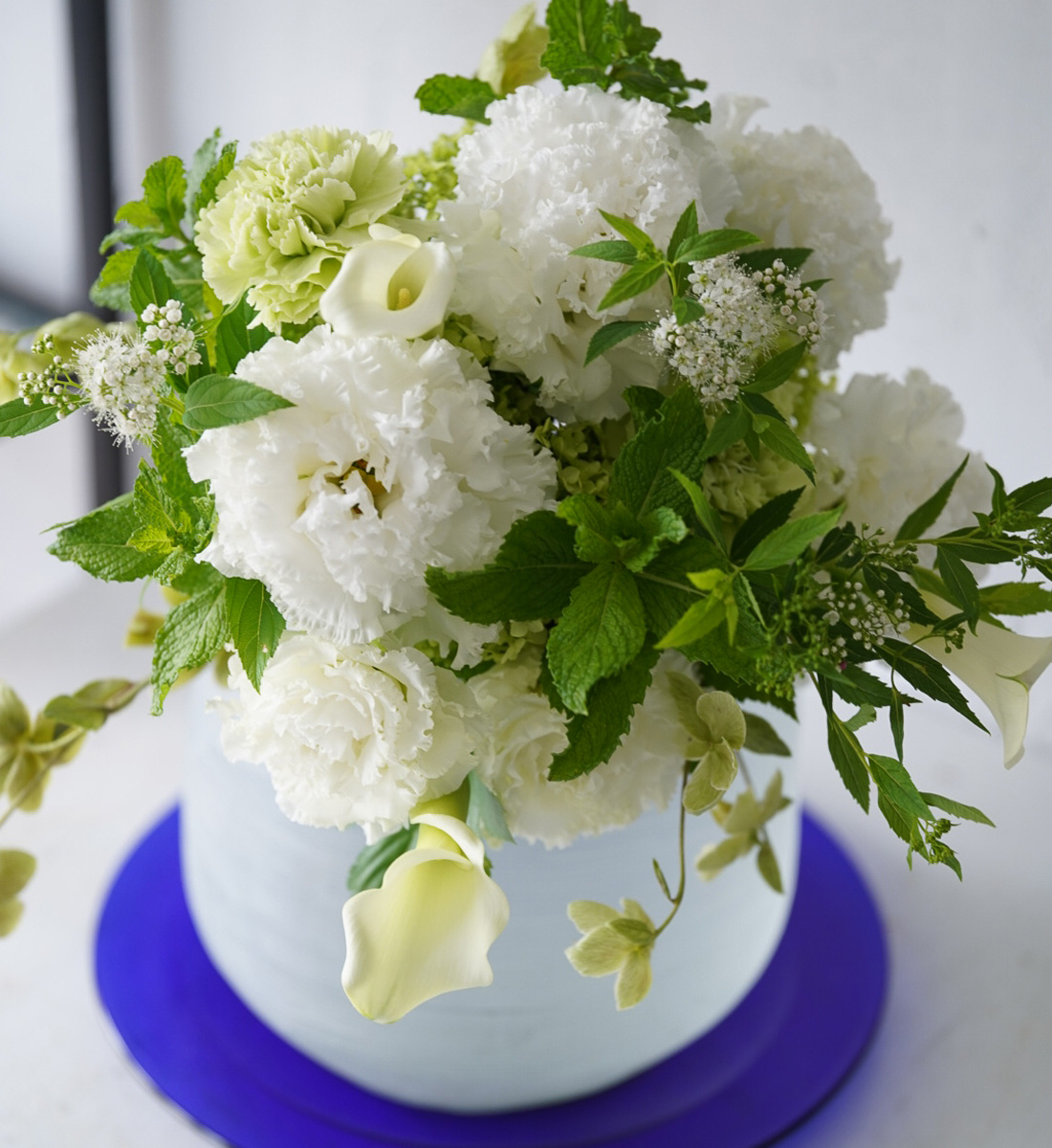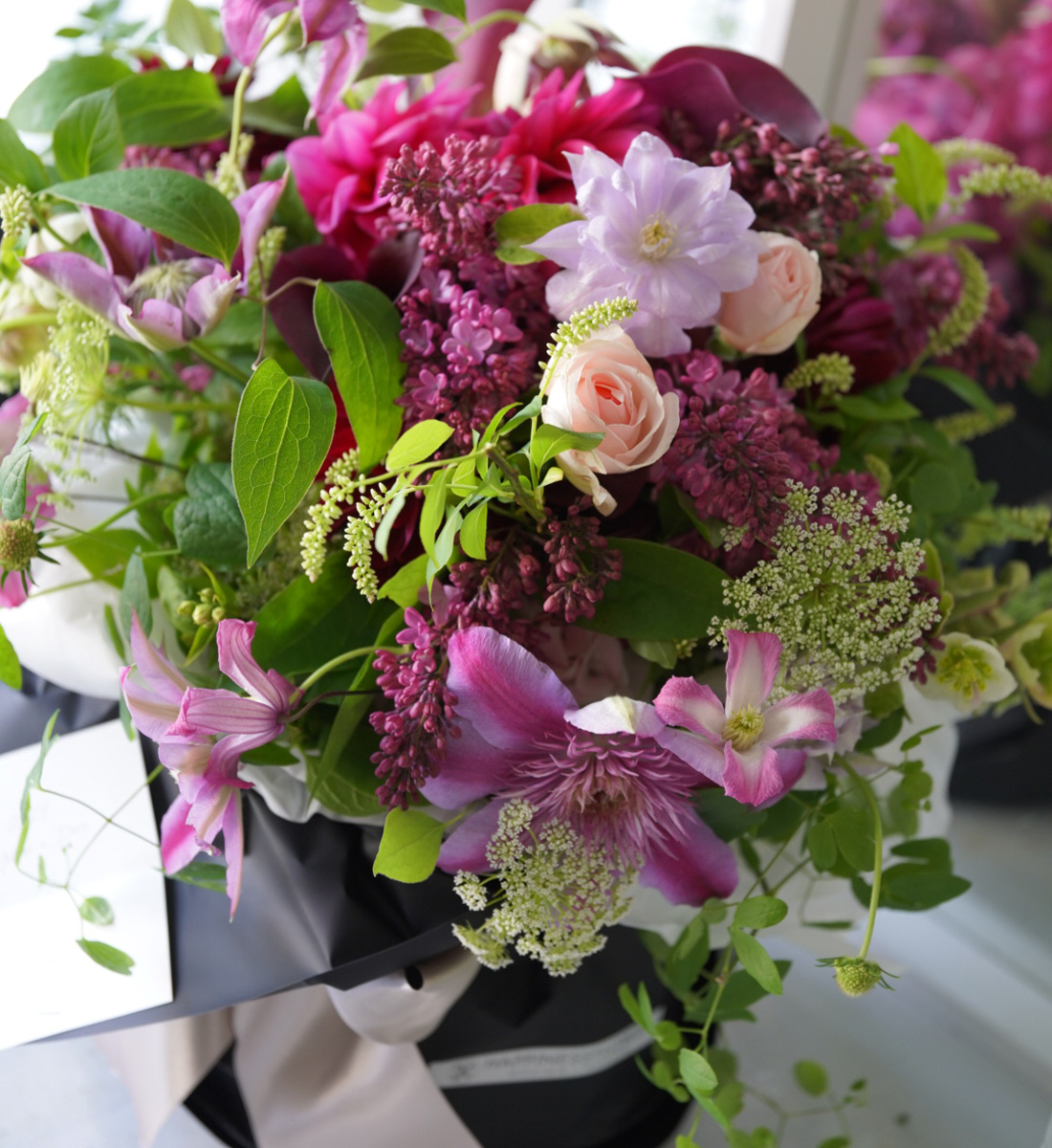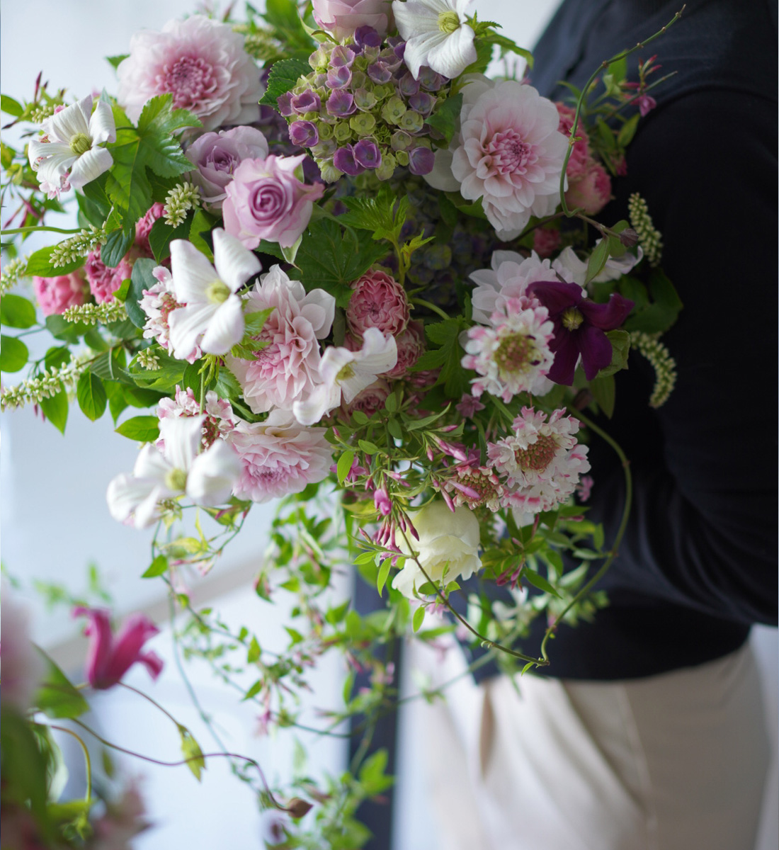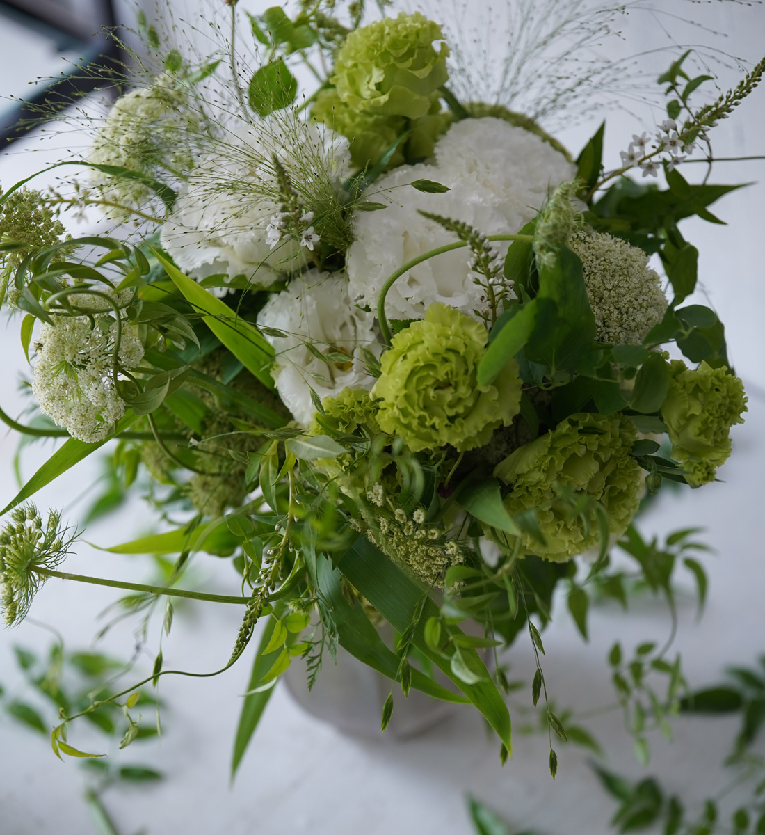 花の密度をギュッと凝縮したデザインで丸型スタイルの花束です。自然の法則を取り入れて素材感に合わせたレイヤーで作るbouquetは色々なベースにもマッチしやすく、女性へのGIFTやお洒落な演出をしたいシーンなどにお勧めです。