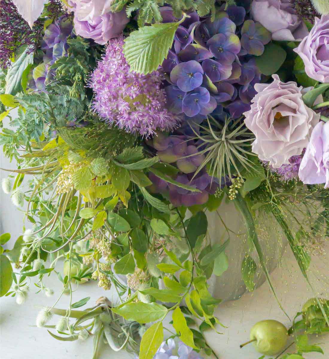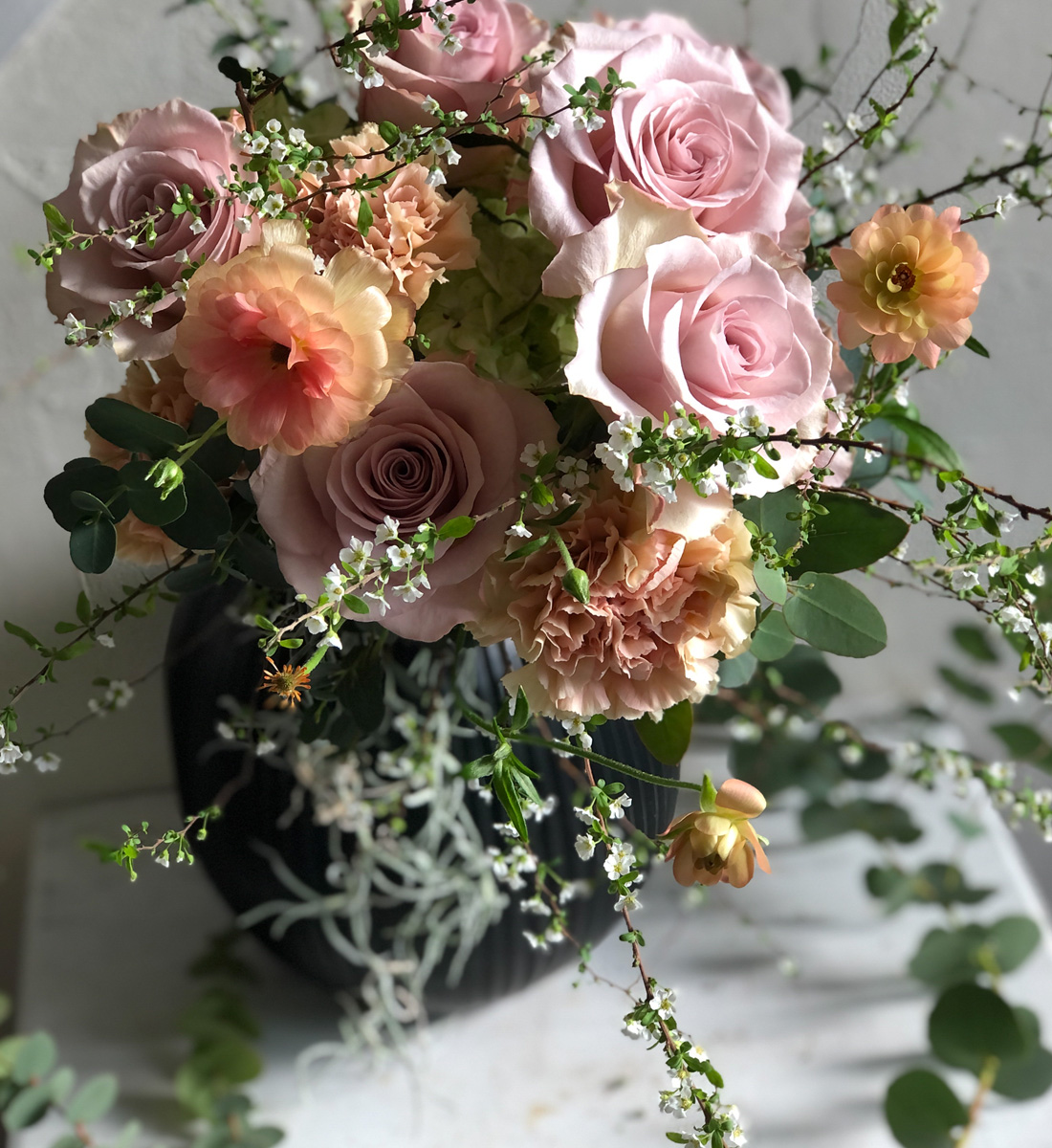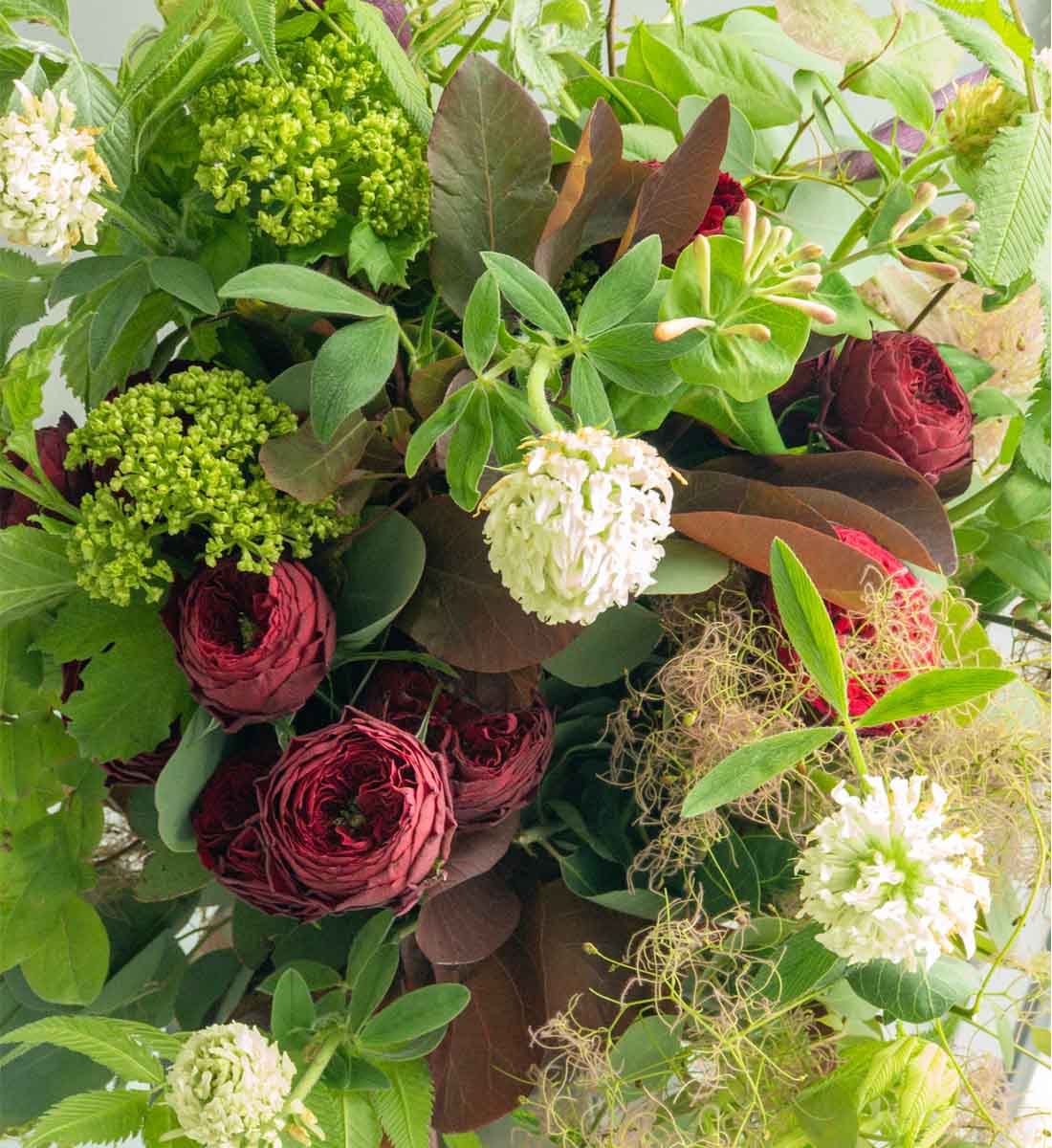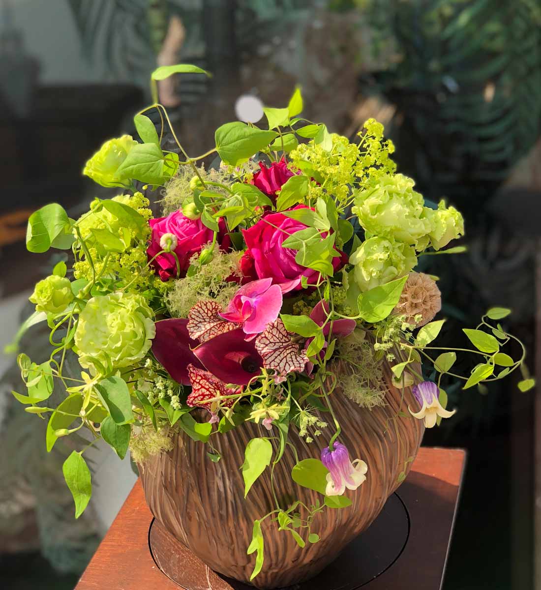 花の密度をギュッと凝縮したデザインで丸型スタイルの花束です。自然の法則を取り入れて素材感に合わせたレイヤーで作るbouquetは色々なベースにもマッチしやすく、女性へのGIFTやお洒落な演出をしたいシーンなどにお勧めです。
