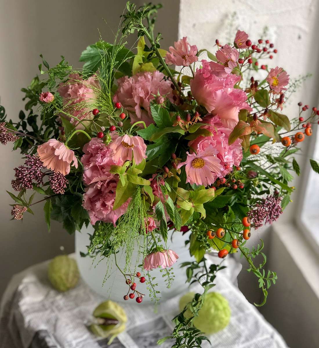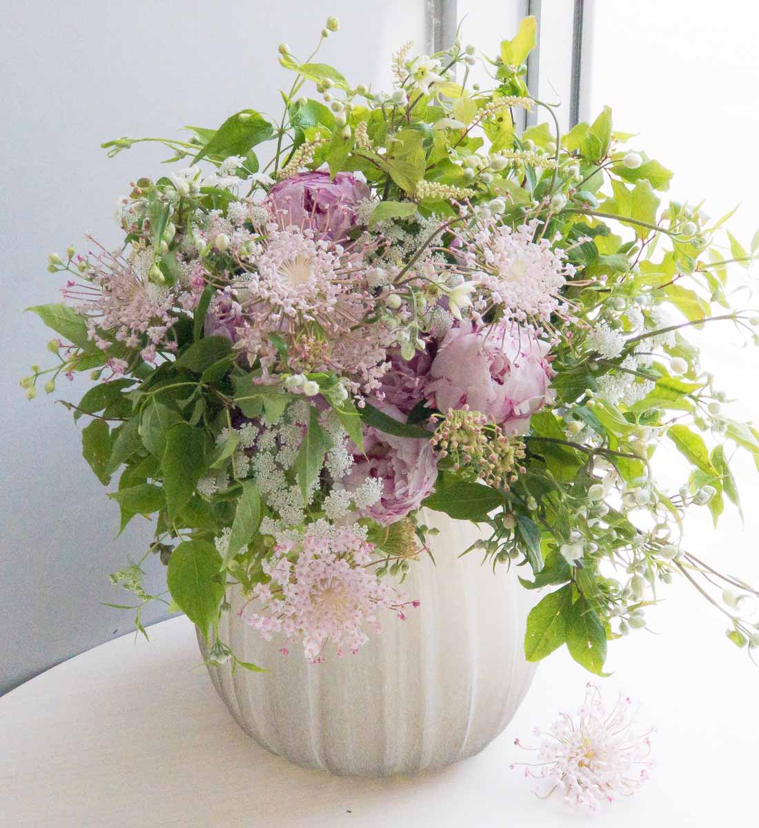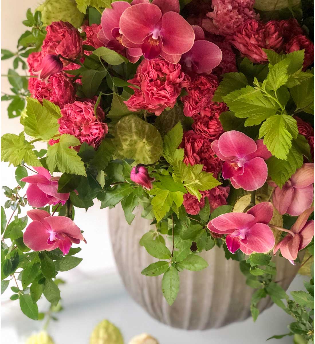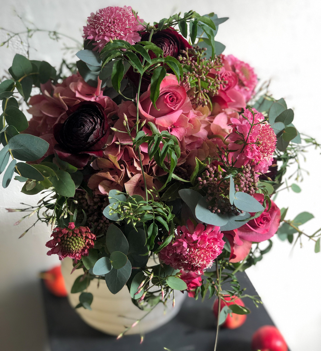 花の密度をギュッと凝縮したデザインで丸型スタイルの花束です。自然の法則を取り入れて素材感に合わせたレイヤーで作るbouquetは色々なベースにもマッチしやすく、女性へのGIFTやお洒落な演出をしたいシーンなどにお勧めです。